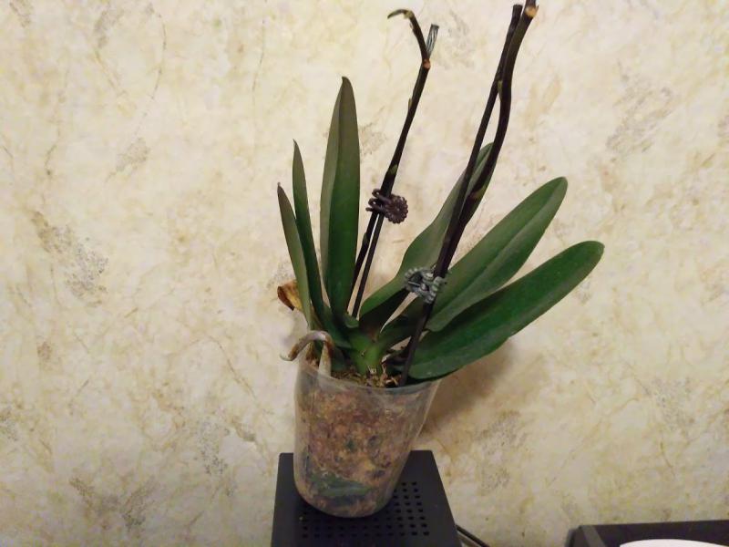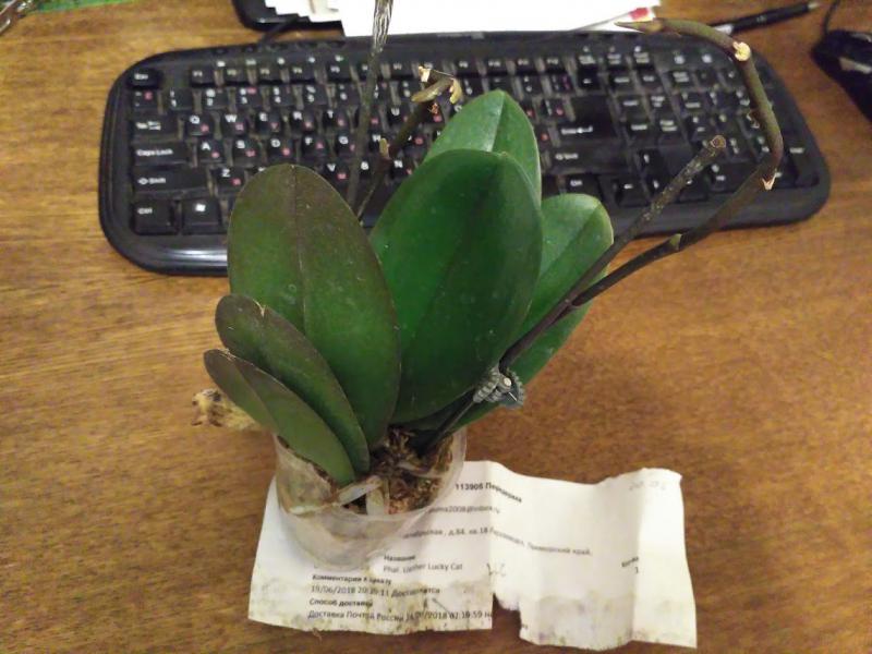 Растение 1,7 с пеньком от цветоноса. Корни хорошие. Мох сильно пересушен, как камень. Один лист отвалился в посылке, второй отвалится на днях.