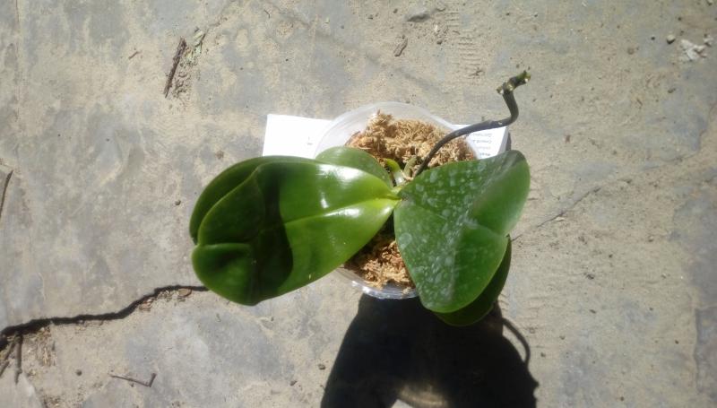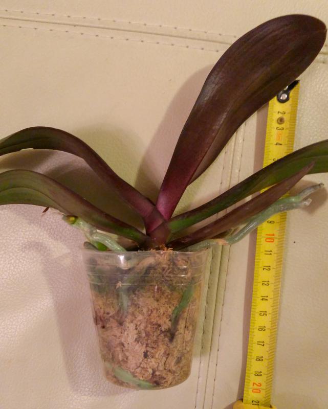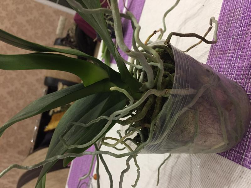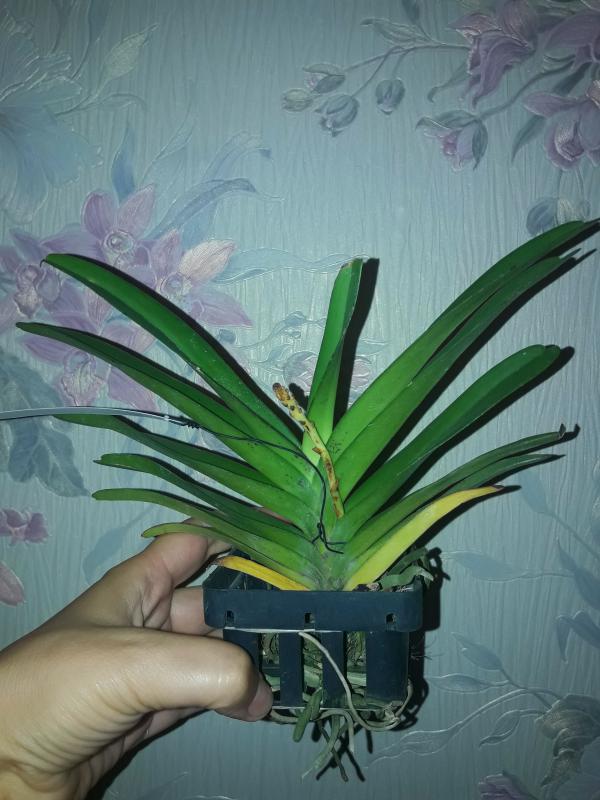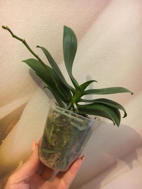 Шикарное растение с цветоносом! Ко мне пришел отцветшим, следы от 3х цветочков. Листиков 4 пары, мох был слегка влажный, еще не пересаживала. Состояние корней не знаю, но сбоку один виден зелененький.