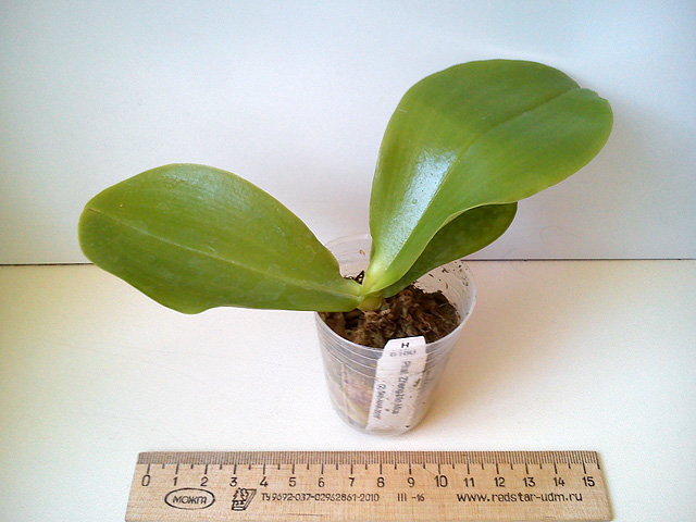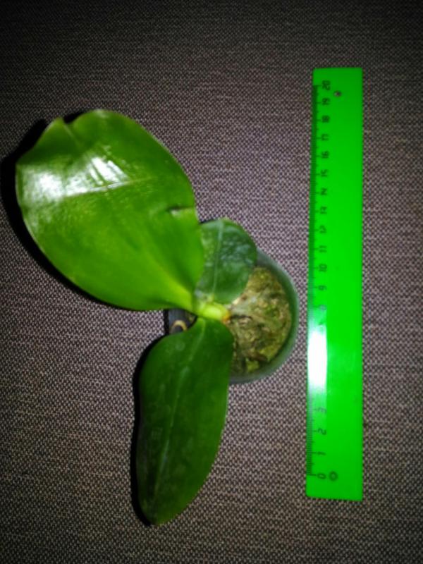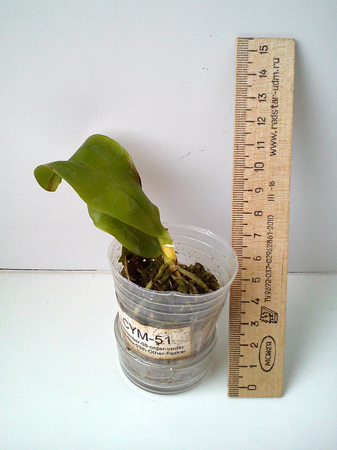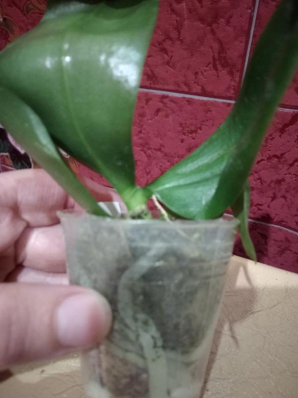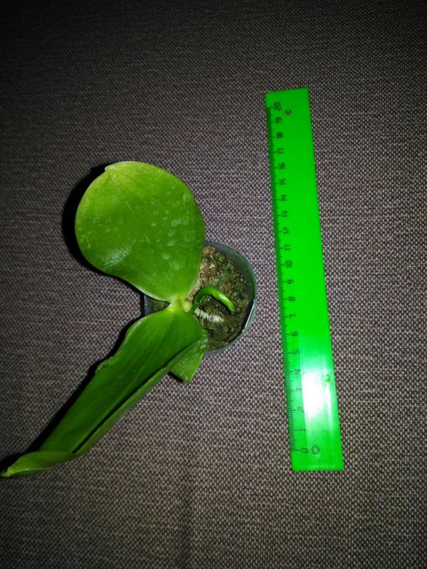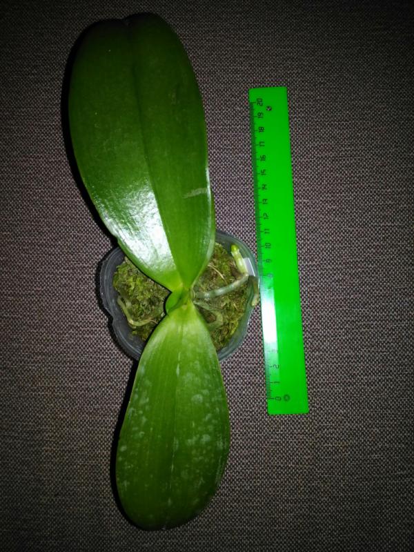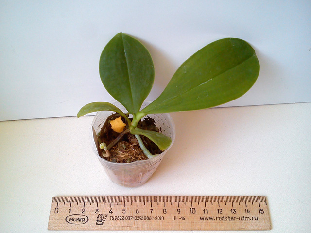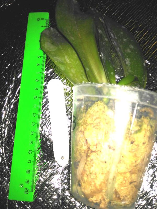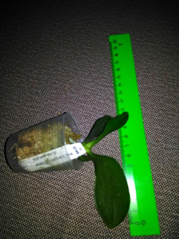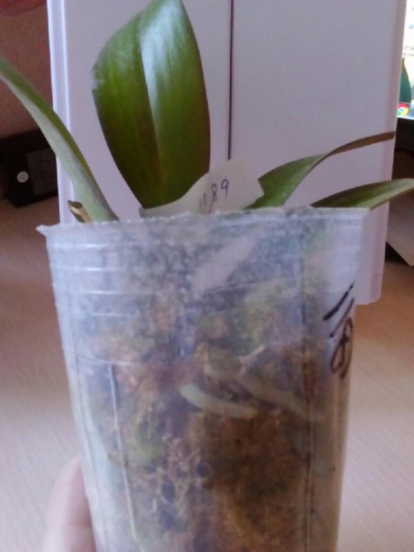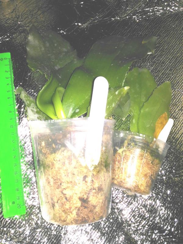 Пришло растение с тремя листиками, самый длинный из которых 13 см, а самый маленький полсантиметра. Корней живых много. В стаканчик этого размера перевалено недавно. Внешний слой мха свежий, корни к нему еще не пробились.