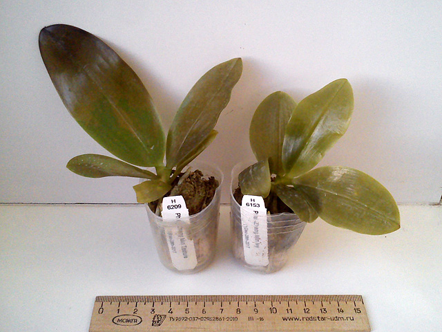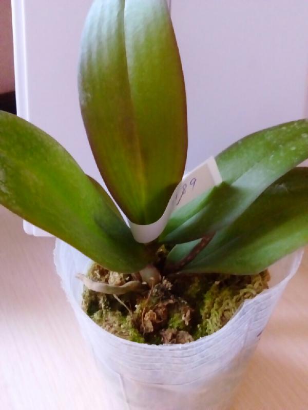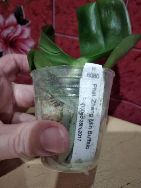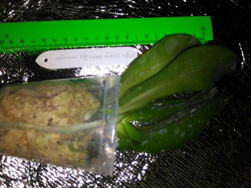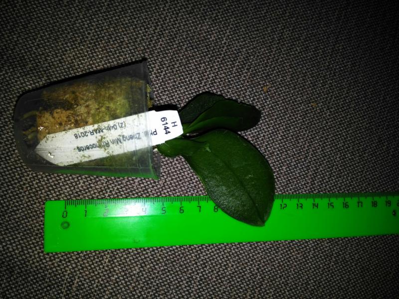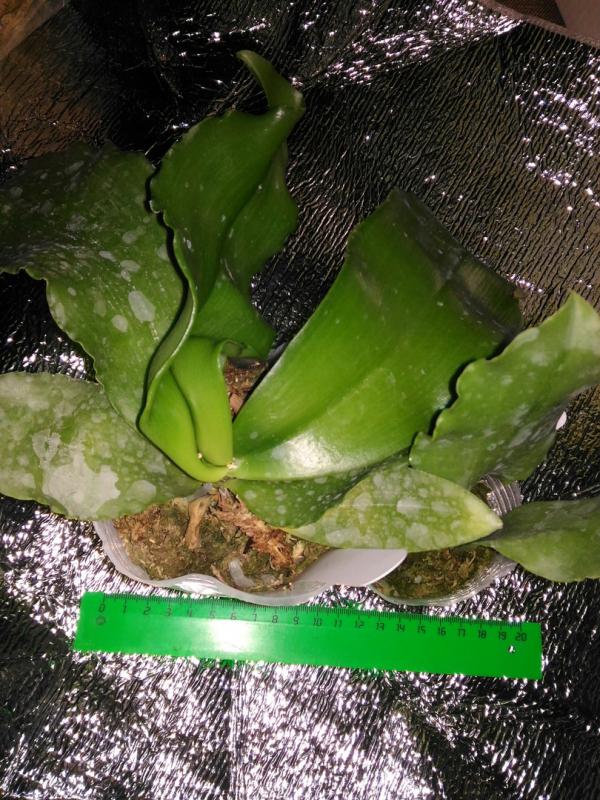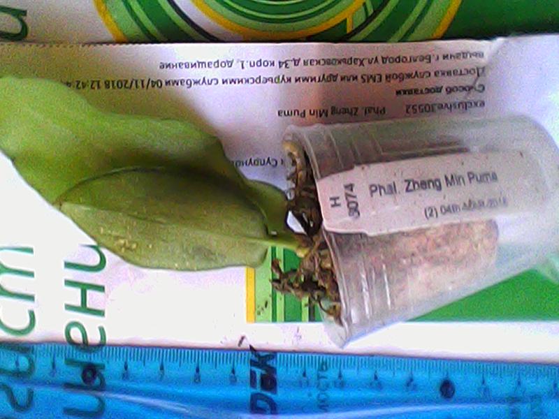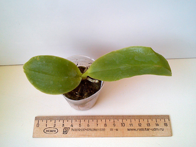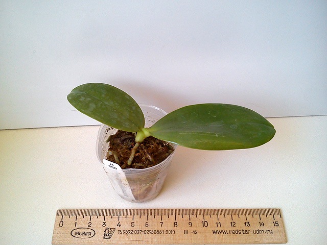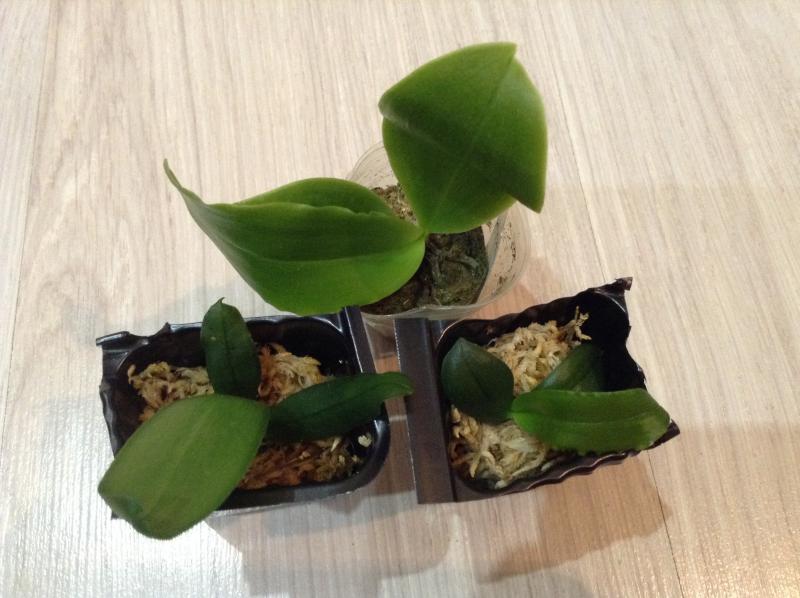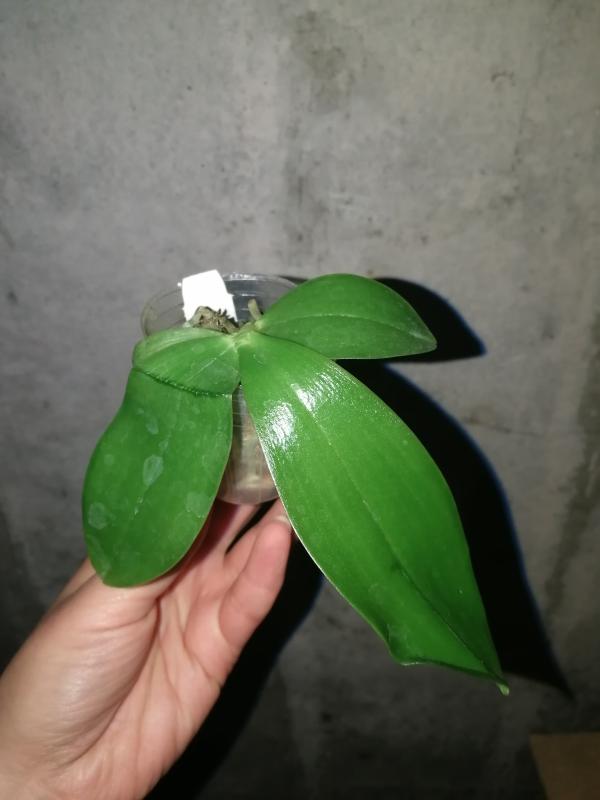 Пришло растение с тремя листиками, самый длинный из которых 13 см, а самый маленький полсантиметра. Корней живых много. В стаканчик этого размера перевалено недавно. Внешний слой мха свежий, корни к нему еще не пробились.