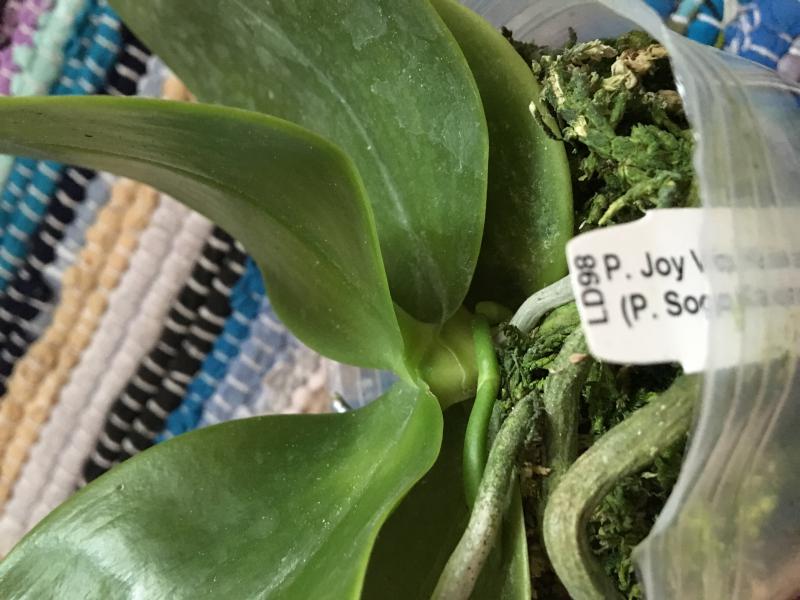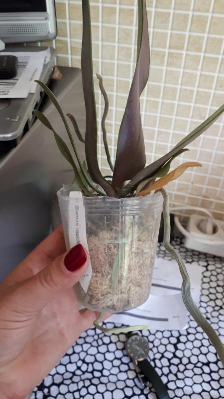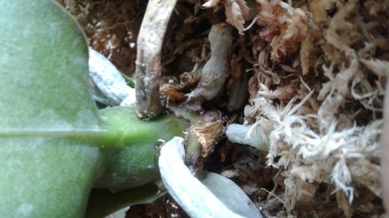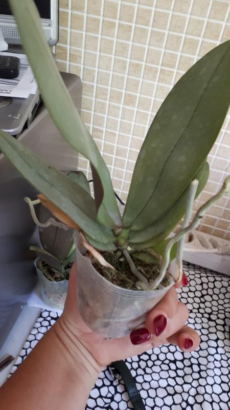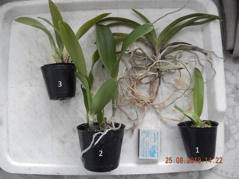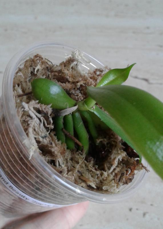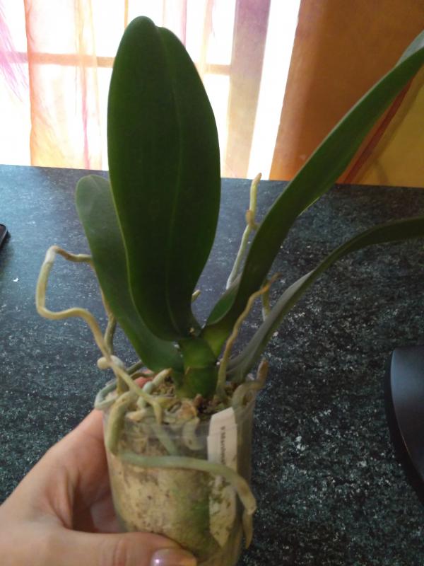 Получено растение из 4-х бульб. Одна потеряла листья в пути (в газете лежали засохшие и 1 засохший висел на бульбе), одна молодая сильно качается, но ножка вроде не надломлена, две отличные, одна из которых с цветоносом. Есть молодой только проклюнувшийся рост. Растение в усушенном мхе, потеряло около половины корней-засохли. Это не беспокоит, так как каттлейные обычно прекрасно наращивают корневую. (Эпикаттлея Siam Jade AVO из спеца обросла корнями за 2 недели и рост жирный выдала)