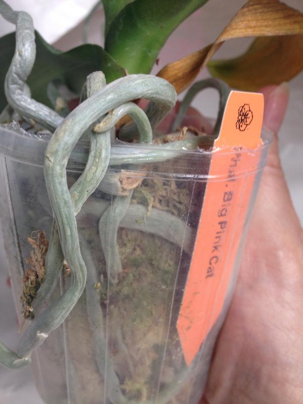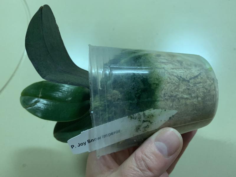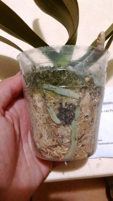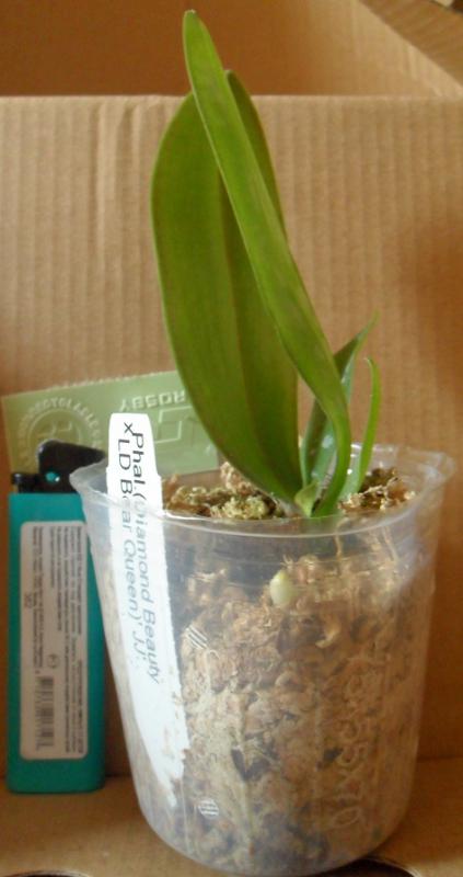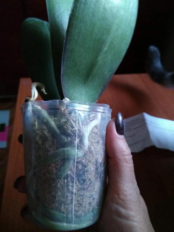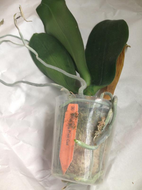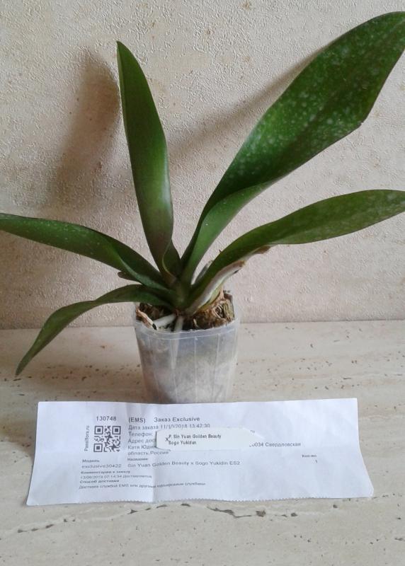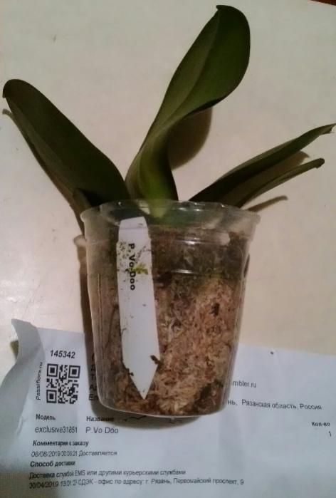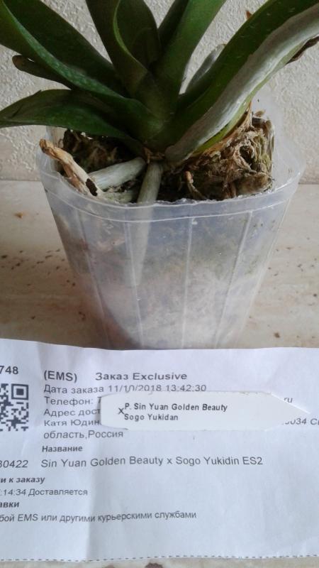 Истерзанное, пересушенное растение. Все корни, что есть - на иссохшей кочерыжке, мох превратился в труху. Шея выглядит здоровой, листья измяты и переломаны. В целом, наверное, жизнеспособно, если приложить усилия. До крайности обидно получать такие растения.Из плюсов - хорошая упаковочная бумага и неожиданно чистая, новенькая бирка )))))