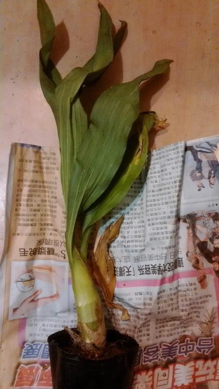 По пять длинных живых листьев, в горшочках с сухим мхом. Одно растение с хорошей бульбой среднего размера, второе с толстенькой откормленной бульбочкой)