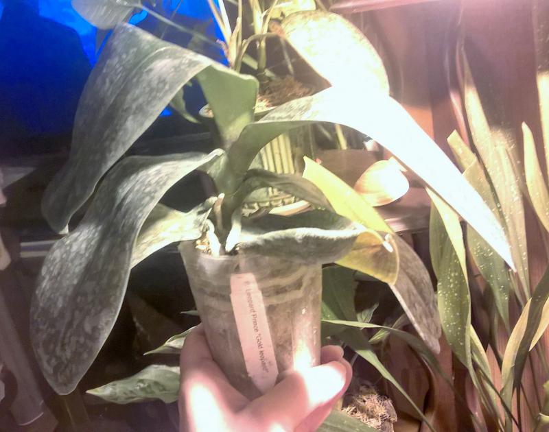 Леопард пришёл размера 3, в горшке 2,5. Много корней, есть растущие. 7 больших толстых листьев от 10см до 20см, все в хорошем тургоре и в идеальном состоянии. Растение цвело, виден старый срезанный цветонос и уже растет новый около 6см.