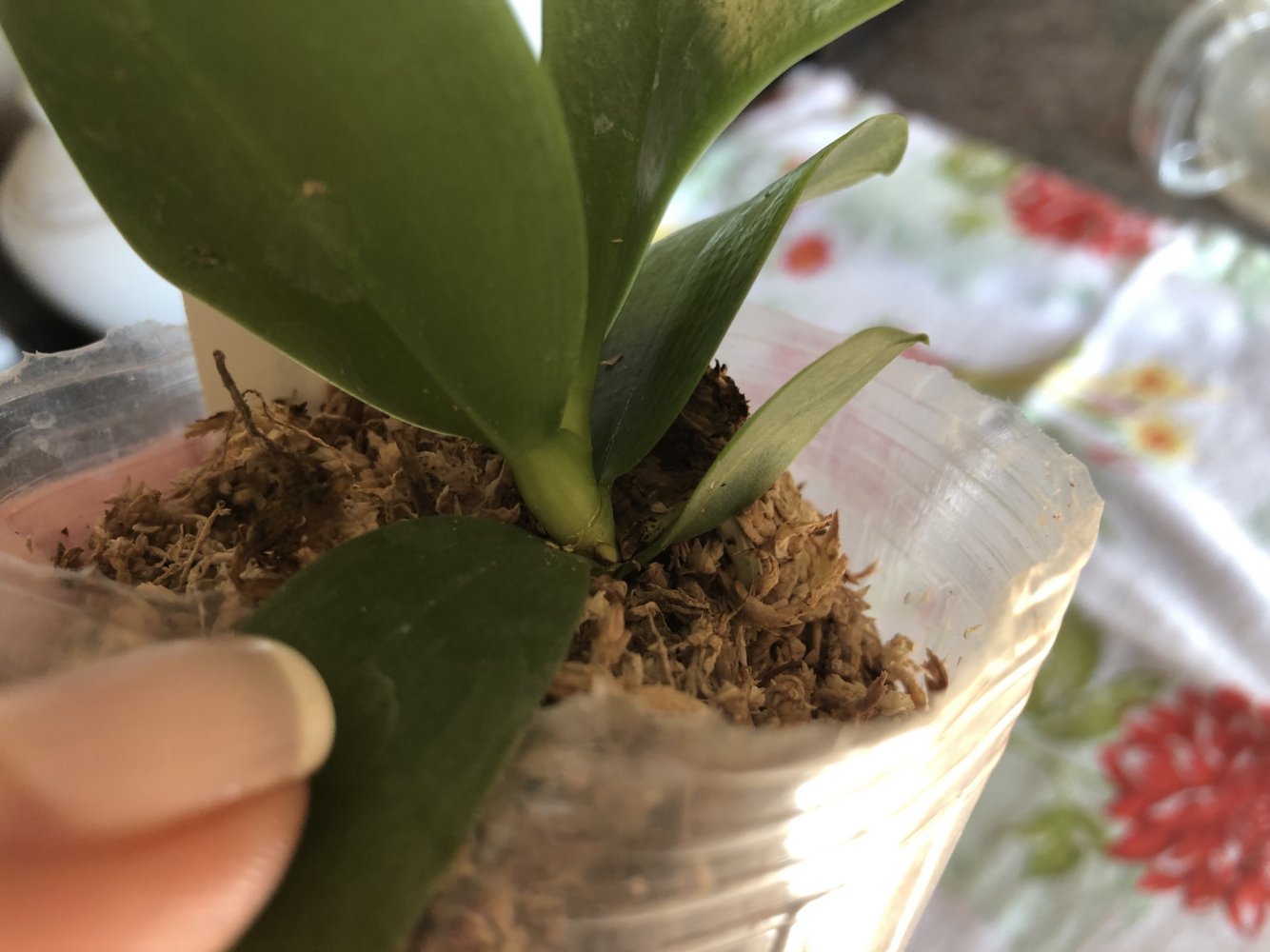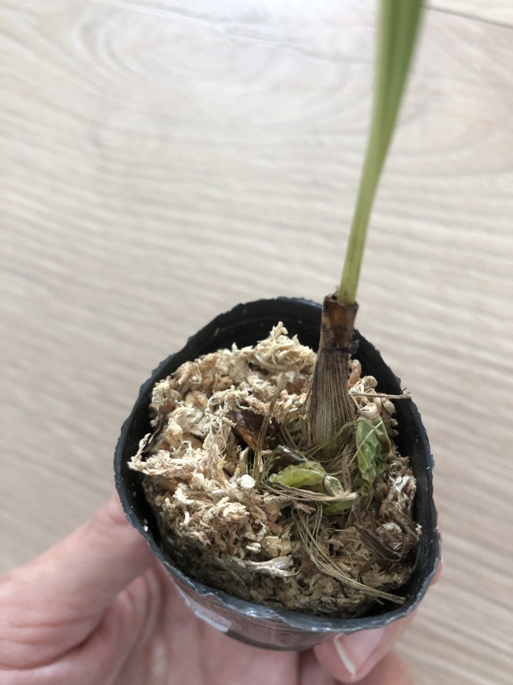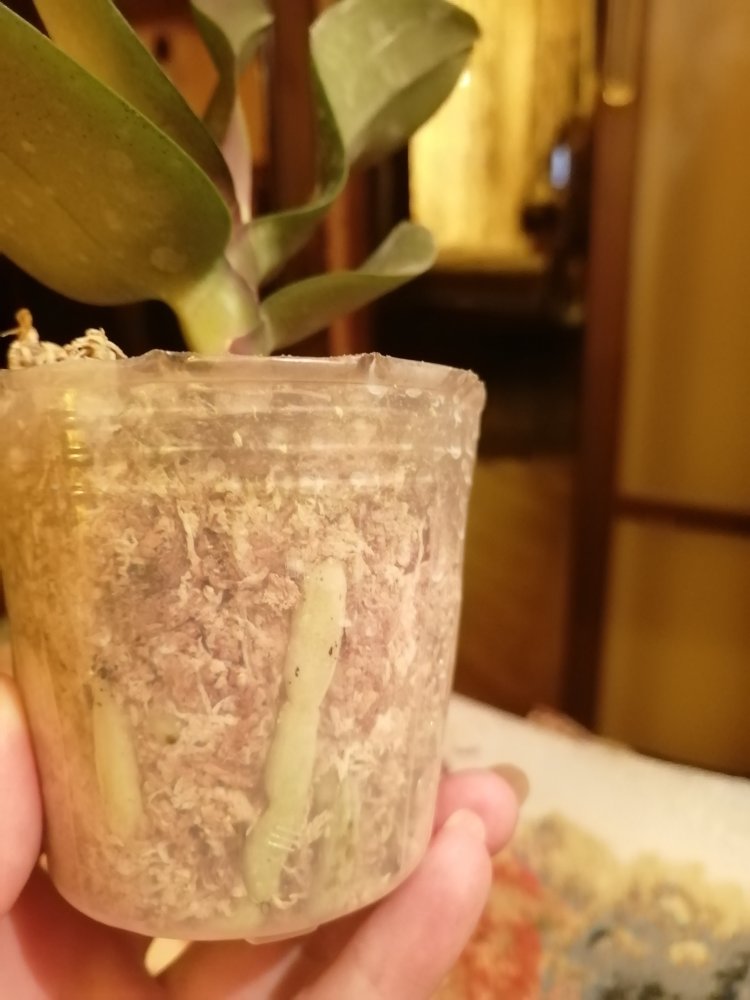 Размер 2,5, мох сухой, корни видны. 2 пары листьев, растëт новый лист. Растение в хорошем состоянии, тургор в норме.