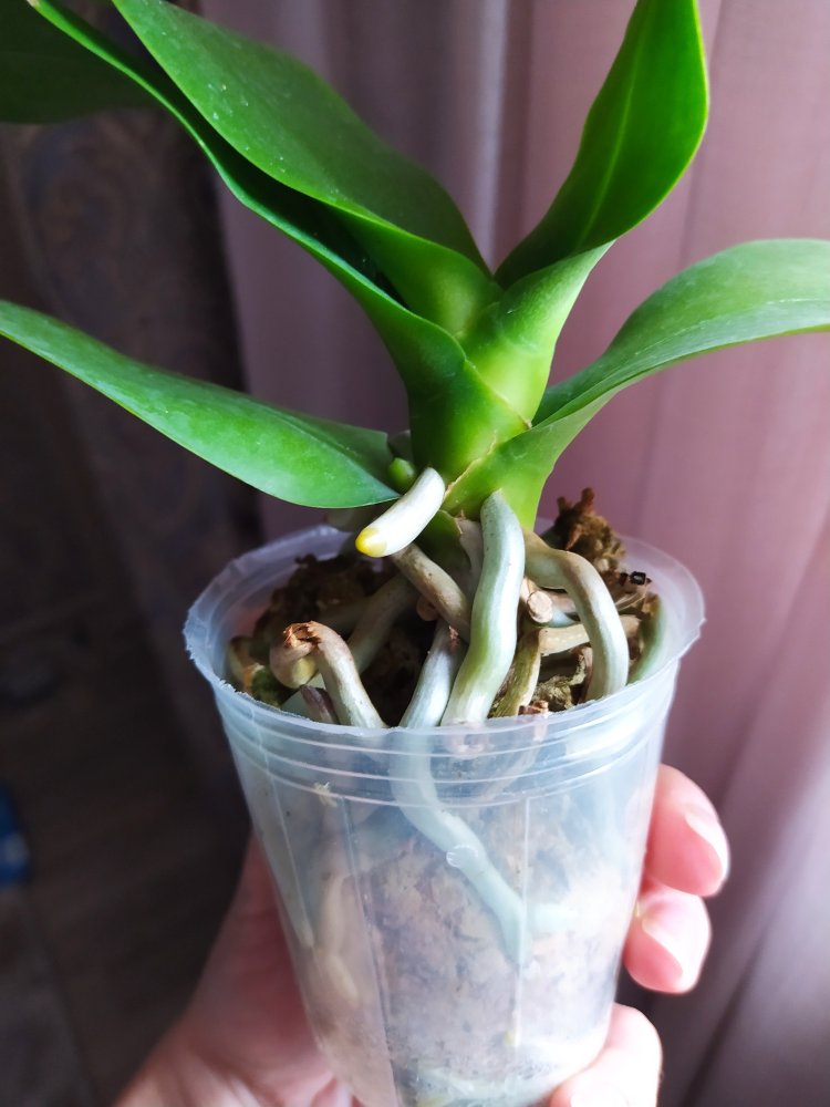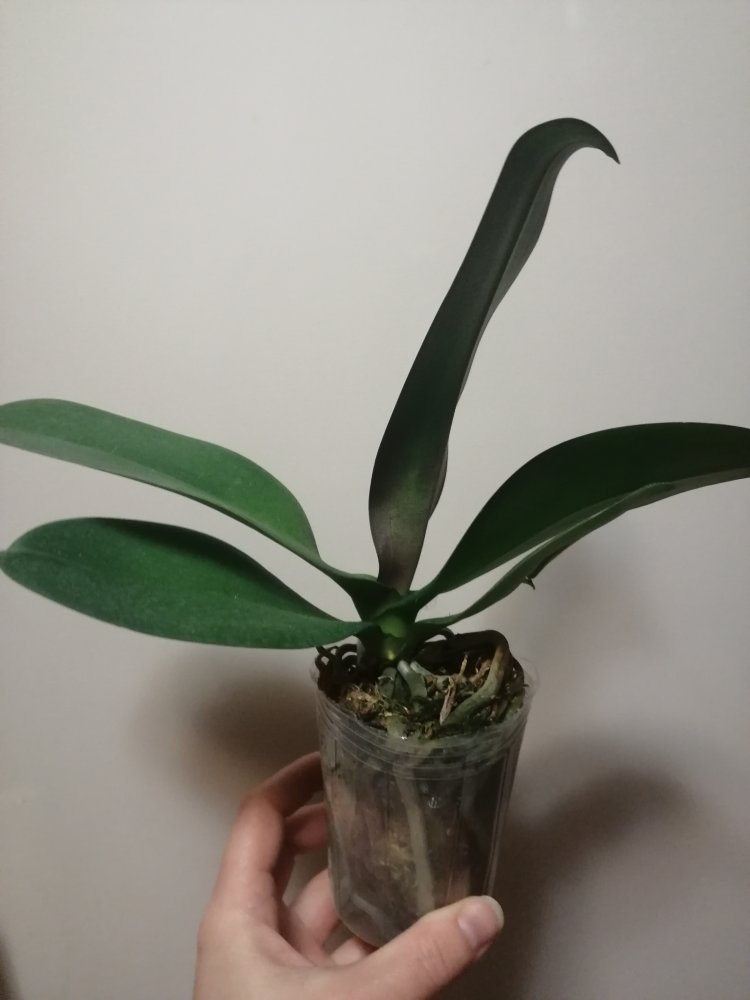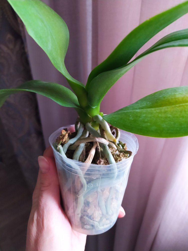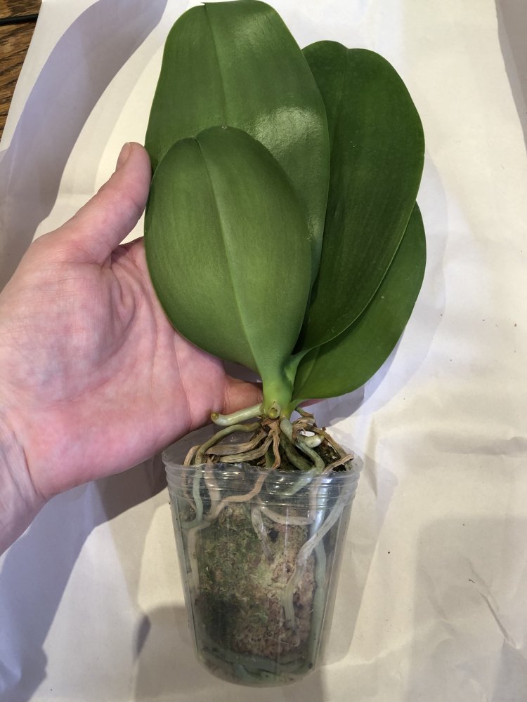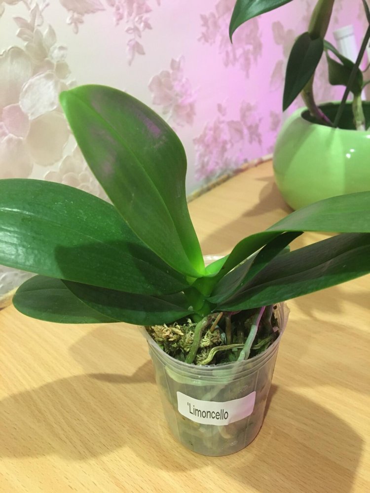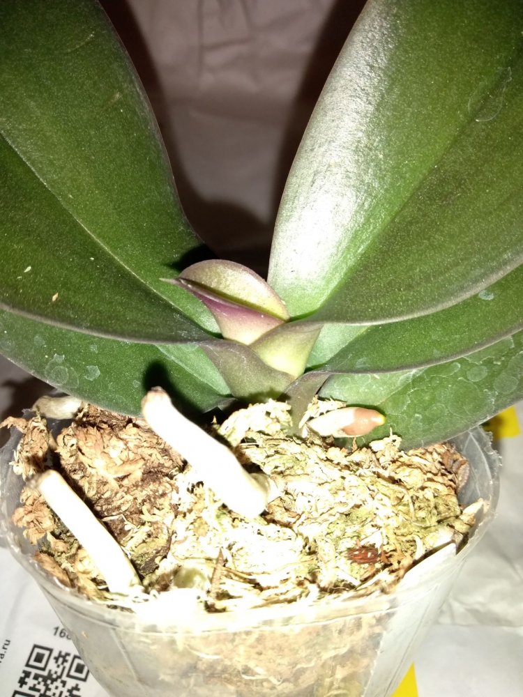 Крепкое растение, готовое к цветению. Мох слегка влажный, полно живых корней. На верхнем листе есть сухое пятно, похожее на ожог. В целом прекрасное растение. На фото всë видно.