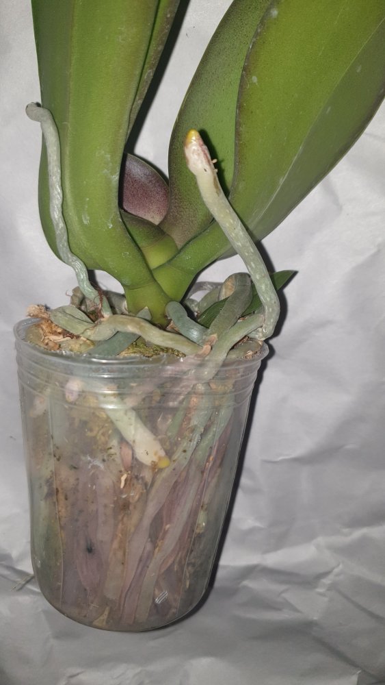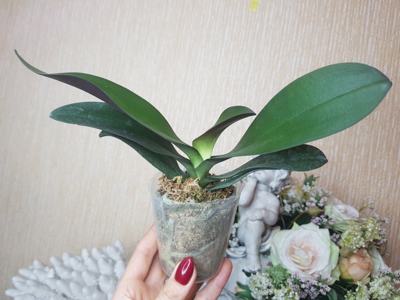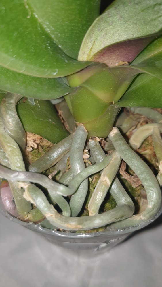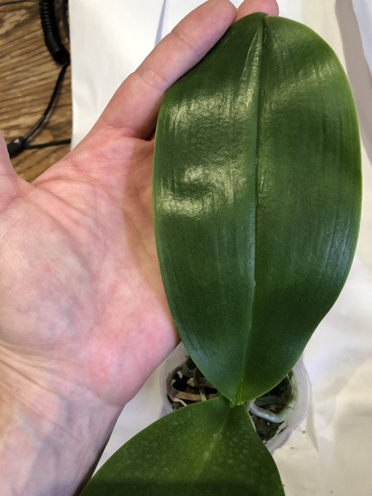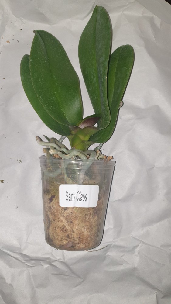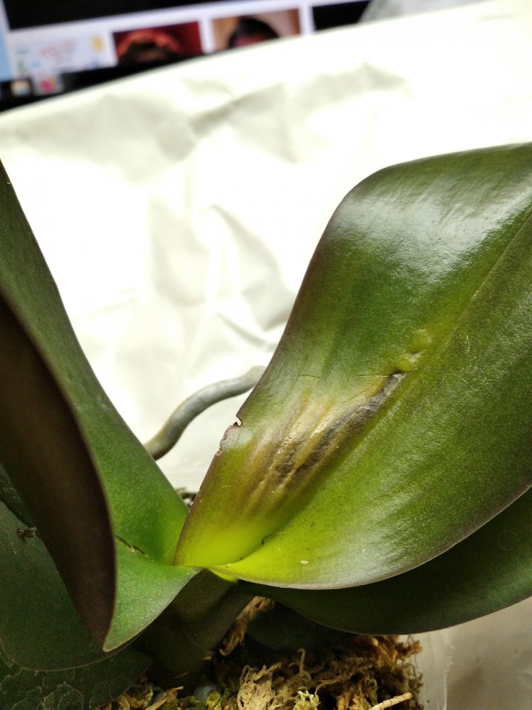 Крепкое растение, готовое к цветению. Мох слегка влажный, полно живых корней. На верхнем листе есть сухое пятно, похожее на ожог. В целом прекрасное растение. На фото всë видно.