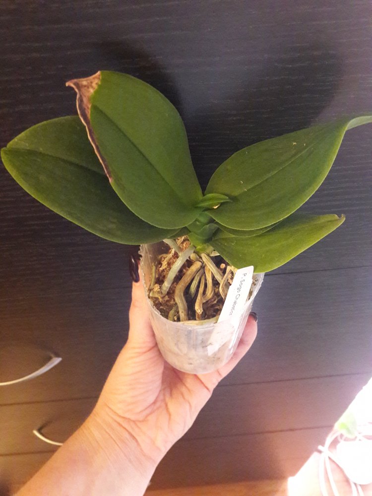 Phal. blue ribbon СМС пришло 23.11.2020, забрала так же 23.11.2020. Крепкое, взрослое растение. 3 пары "взрослых" листьев, последний лист 18 см (фото 2). Растению явно тесно в горшке 2,5 - много растущих корней, вполне готово к пересадке. Спасибо.