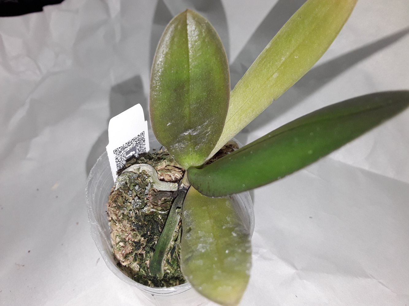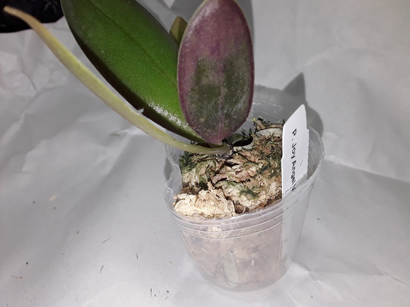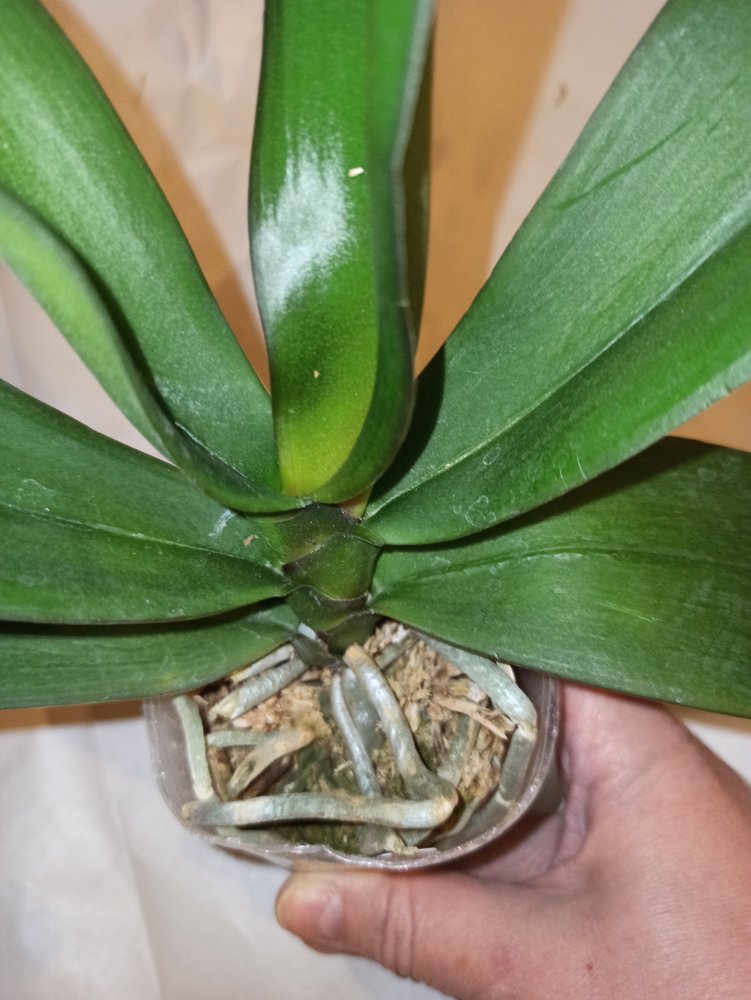 В пластиковом стаканчике 2,5, во влажном мхе. Корней сквозь мох не видно. Всего 3 листика. Два - размером до 10 см., один - см.3, не более.