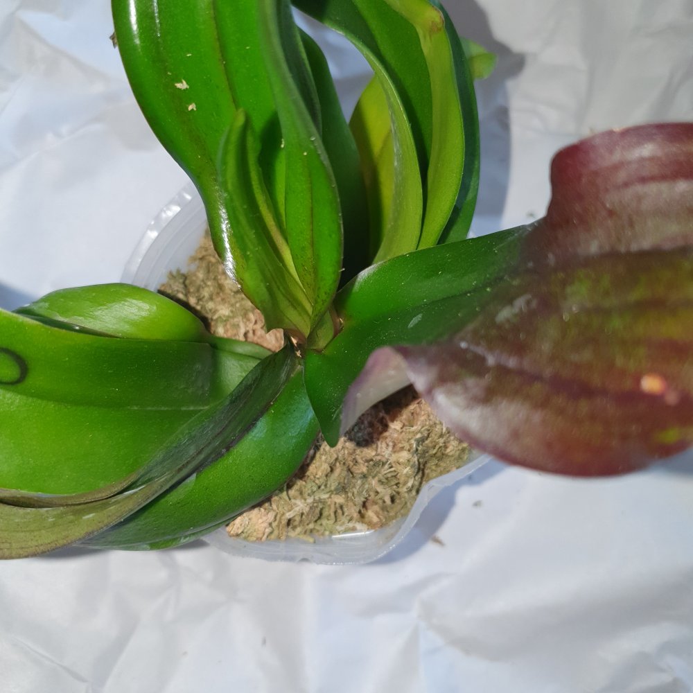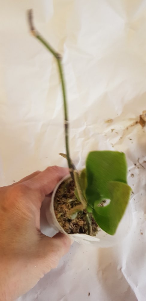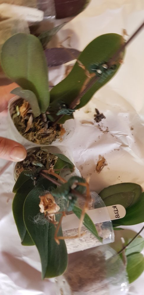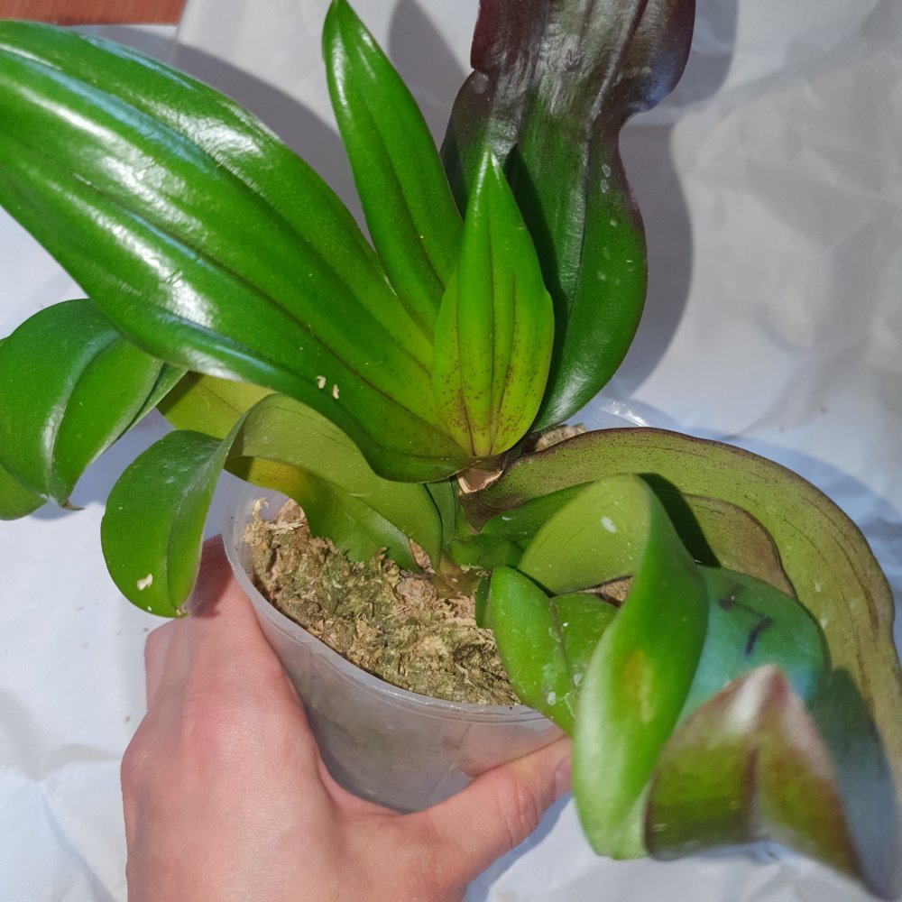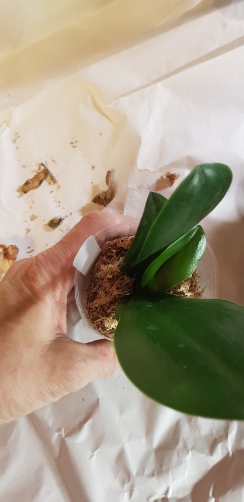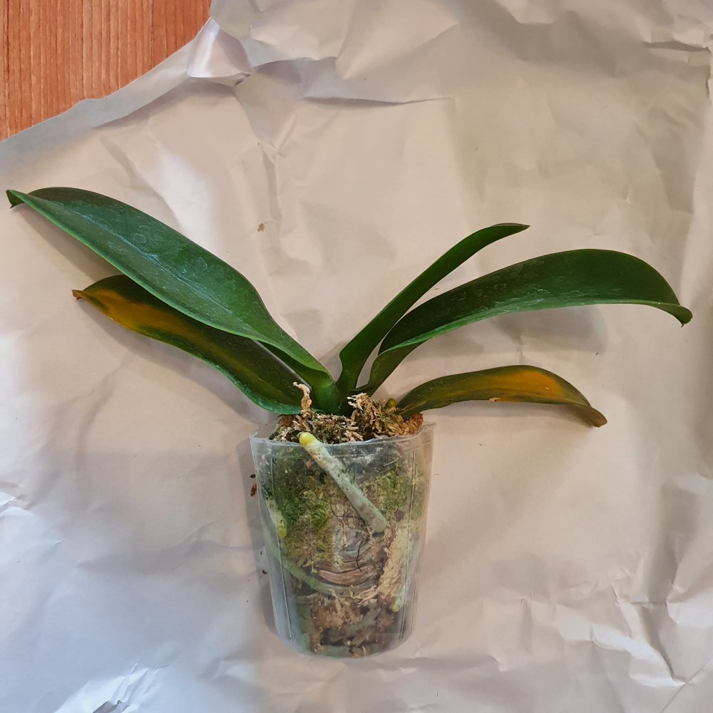 Нижние листочки желтят, но это от стресса я думаю, т.к. корни живые раскукленные, шейка чистая, листья здоровые и в тургоре, есть остаток цветоноса.