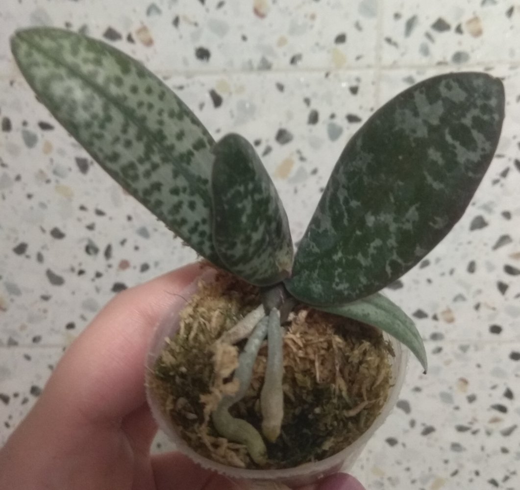 1 x Phal.schilleriana silver - получен в первый день прихода смс. Растение р-р 1,7, три листика, самый большой 6,5 см, мох слегка влажный, бирки нет.