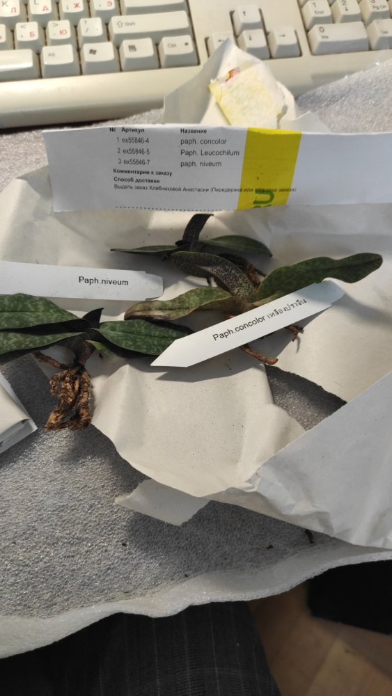 приехали малыши, но вполне отличные! Бирка отсутствует только у одного. Корни хорошие, тургор не потерян. Это мои первые Пафиопедилумы, немного страшно