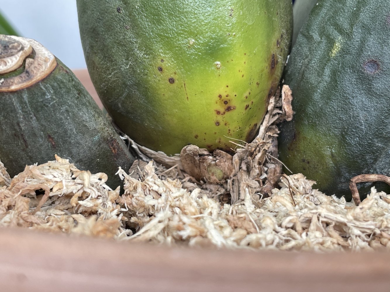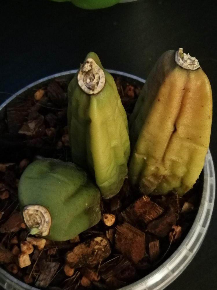 @julesja, нет - нет, делить без крайней необходимости не нужно! Получите 2 глубокие реанимашкки! Так у нее шансов больше прижиться. Пятен много, их все перед посадкой надо Максимом замазать, даже на нижней части ризомы. Пипки могут еще и цветоносами оказаться. Она ж из Южной Америки, если правильно поняла - там как раз весна на носу и цветение ликаст. Посадить ее нужно на "горку" - субстрат так горшке и располагать - от нижней бульбы вверх лесенкой до верхней бульбы. Субстрат придется влагоемкий делать, хоть это и опасно с ее пятнами, но корней нет совсем. Можно крупную кору пополам с резаным сфагнумом (сверху тогда мхом не укрывать). Знаю, любите очень влагоемкие субстраты делать, тут не нужно этого. Иначе очень велика вероятность загнивания. Сейчас ее хоршо временно посадить для адаптации и наращивания корней, ну и наблюдения за состоянием, в маленький горшок и временный субстрат.