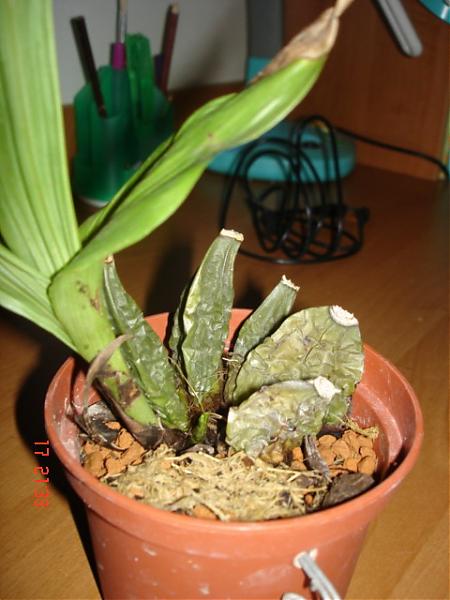 Твоя растюха, так хоть кружочками на салат нарезай... Но вот подумай - а сколько вообще резервных почек для нового роста на каждой бульбе, а??? Ну не только у ликаст. Обычно одна сильная, редко и только у хороших кустов две. Как правило, вторая менее сильная и при повреждении и отмирании роста из первой быстренько собирается и замещает. Дальше есть еще, скажем, на оголенных бульбах у каттлей их хорошо видно, и чем дальше по номеру тем слабее, тем больше времени надо для активизации и прорастания. Я тебя уверяю - будет счастье, ежели прорастет теперь еще где-то что-то (если уже есть один рост, то тебе повезло). Ну я понимаю, что боимся, что последнее представление перед самоубийством - но ведь весна на дворе, гормональная картинка внутри растюхи подходящая; если мы хотим двумя или тремя ростами - ну чего насиловать-то было??? Ну получатся послабее, так скорее всего нет же, пораньше выкинули б корни, хозяйка б получше поудобряла - глядишь, такой specimen нарос бы... Не понимаю. Нет заложенных в предыдущем сезоне цветочных почек - так не заставишь цвести; а вдруг бы они попозже появились?