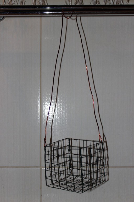 Размер этой корзинки 10*10*10 см, высота подвеса 32 см. Цена 120р.