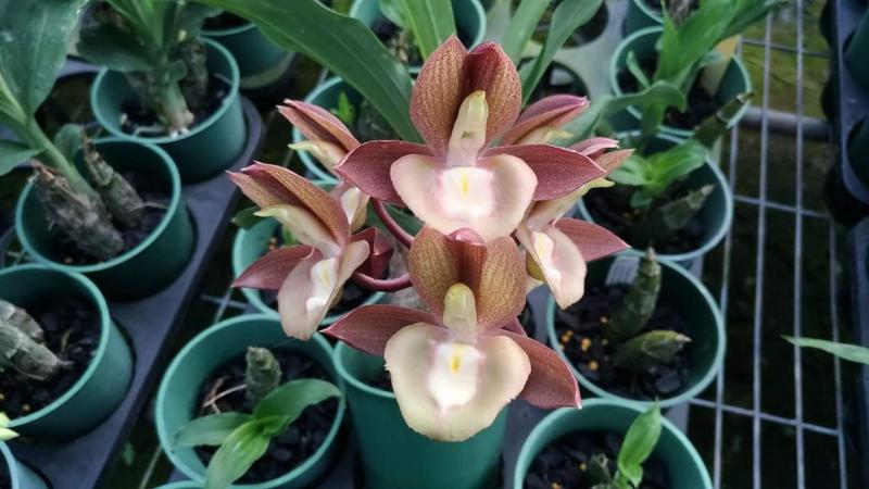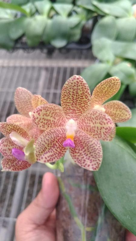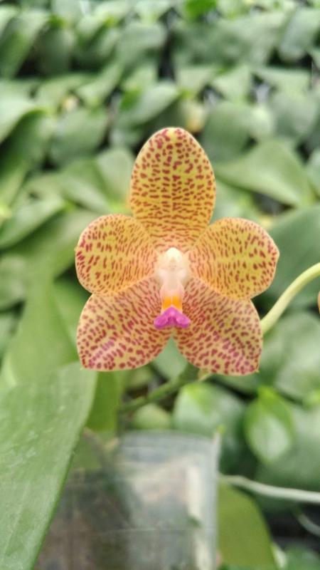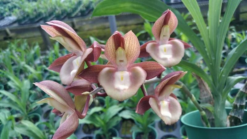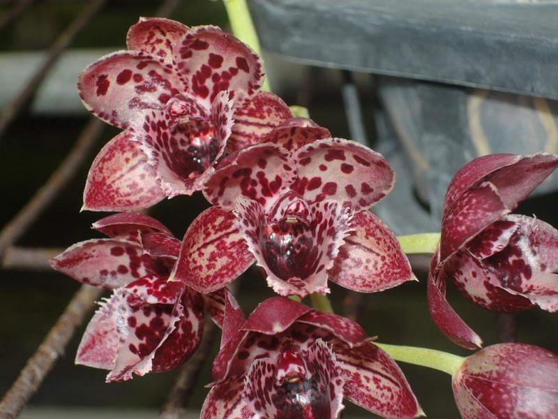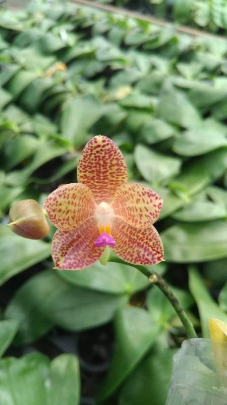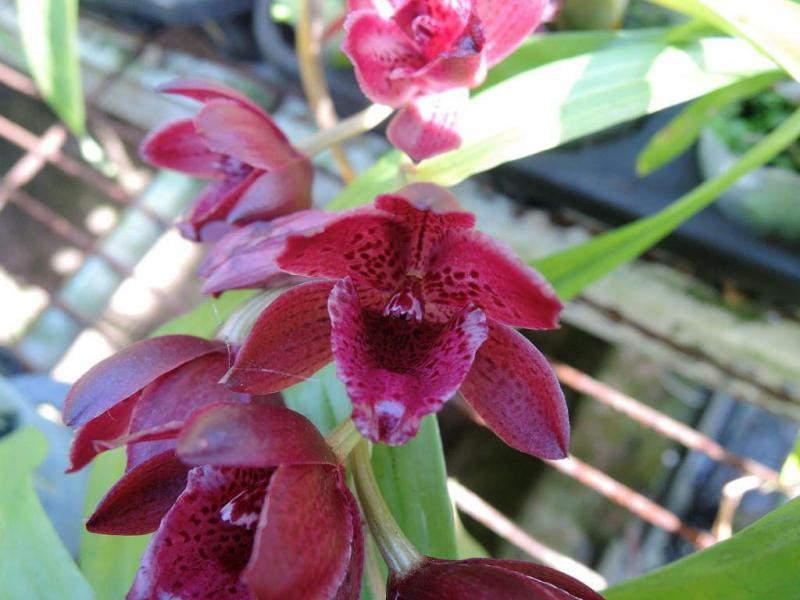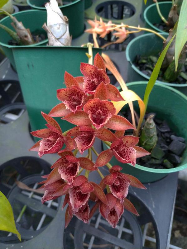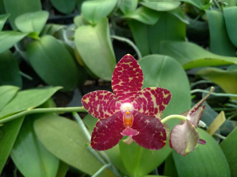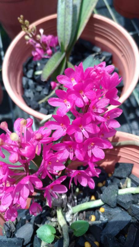 Vanda(Ascocentrum) ampullaceum В природе Vanda ampullacea встречается в Гималаях, Китае, Лаосе, Мьянме, Индии, Бангладеше, Непале и многих других Азиатских странах, где произрастает эпифитно на деревьях на высоте от 300 до 1.500 метров над уровнем моря. Растение моноподиальное, состоящее из стебля (25 см высотой и 1 см шириной), достаточно густо покрытого листьями (растут парами). Листья чаще всего имеют красноватый оттенок или же покрыты красными пятнами, размером 15 см длиной и 1-2 см шириной. Цветоносы свисающие, появляются из пазух между листьями и стеблем, в длину достигают до 12 см и несут в себе множество цветков. Цветы красные или фиолетовые, со шпорой (0,7 см длиной), размером от 1,5 до 2,5 см в диаметре, колонка белая. Сепалии овальные, размером 0,9 см длиной и 0,5 см шириной. Петалии аналогичной формы, только несколько длиннее. Губа тройная, боковые её части прямые, а передняя удлинённая, слегка выгнутая вперёд, с закруглённым кончиком, общий размер 0,7 см длиной и 0,2 см шириной.