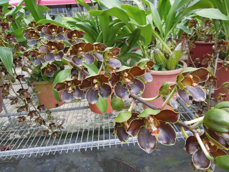 Цветонос один или несколько, свисающий, длиной 15–38 см., с одним или двумя ответвлениями.
