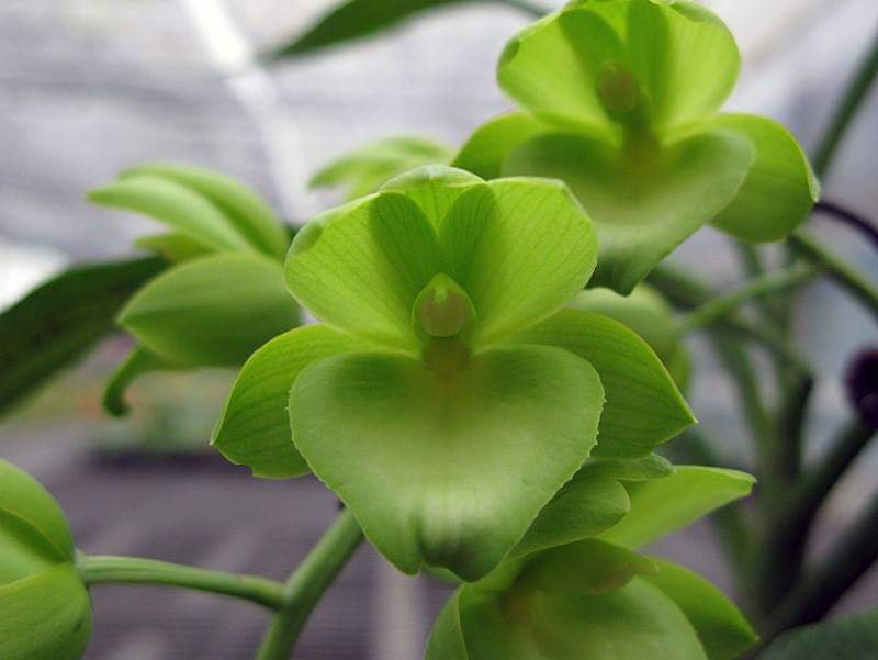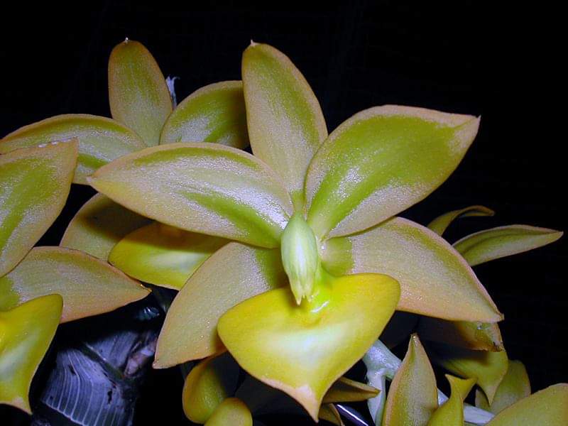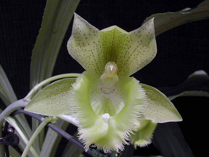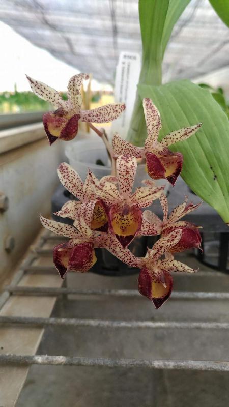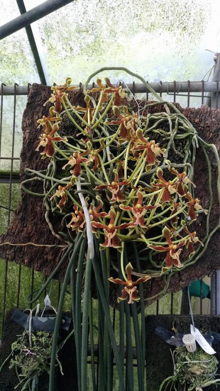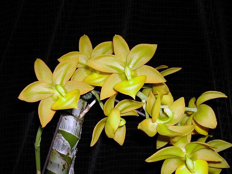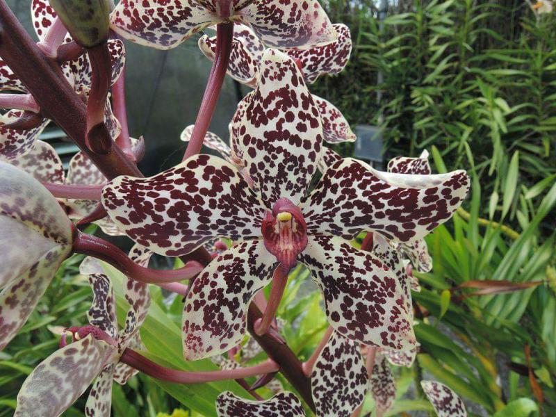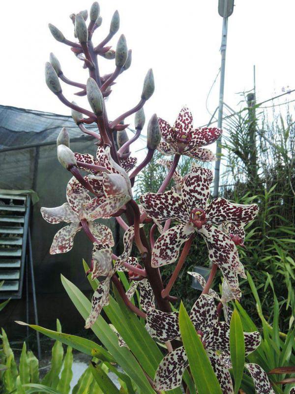 Grammatophyllum wallisii Крупные, гигантские, горячие или теплые растущие эпифиты и редкие литофиты, встречающиеся в равнинных лесах у ручьев и рек на высотах от 100 до 1200 метров в Мьянме, Таиланде, Лаосе, Вьетнаме, Малайзии, Борнео, Яве, Молуккас, Филиппинах, Сулавеси , Суматра, острова Бисмарк, Папуа и Новая Гвинея и Соломоновы острова, и считается самой тяжелой орхидеей в мире и способна стать огромной культурой. Они имеют прямую растяжку, очень длинные, цилиндрические, желтоватые с возрастом, множество ребристых и узловатых псевдобульб, полностью окруженных безлистными и листоносными оболочками и несущих тонкие текстурированные, округлые, линейные или яйцевидные, тупые или острые, изогнутые в апикальных половинках листьев и цветут летом, осенью и в начале зимы, а также летом и имеют длину от 4 до 10 футов [120–300 см], базальную, прямо изогнутую, рацемозную, со множеством цветковых соцветий, которые несут от 30 до 50 иногда ароматных, восковых, последовательно раскрывающихся, продолжительных цветов с самыми низкими, несовершенными и далекими цветами. У этого вида есть прямые, распространяющиеся или опускающиеся псевдобульбы, длина которых может достигать 3 метров, и листья, которые хорошо поднимаются по стеблю, придавая им вид пальмы. Цветение может быть медленным, растения должны быть большими и иметь много зарослей, и даже орхидея может быть спорадической, в лучшем случае, цвести. Этот вид часто встречается в сочетании с муравьями и может извлечь выгоду из их присутствия.