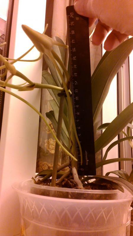 По приезду и пересадке обнаружила цветонос.Мой цветонос не остановился в росте,а продолжил расти.На цветоносе всего 3 бутона.Сам бутон не крупный пока всего 5 см.Шпоры 2 верхних по 13 см,нижний пока 16 см.Мой Angcaecum пелорик.
