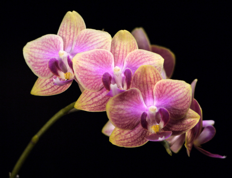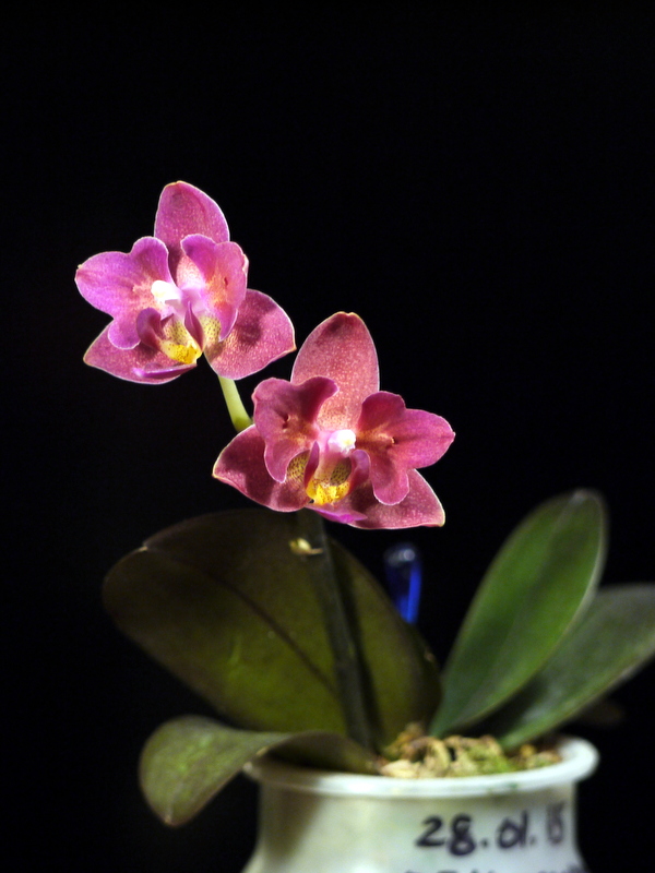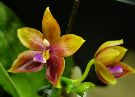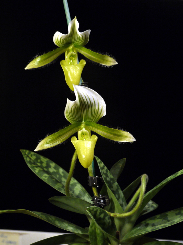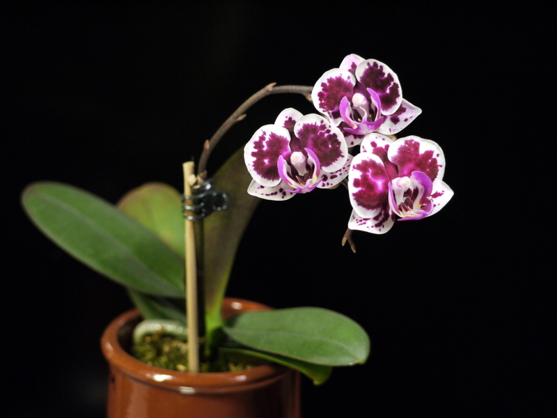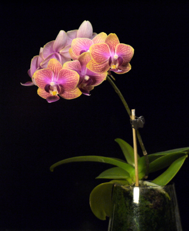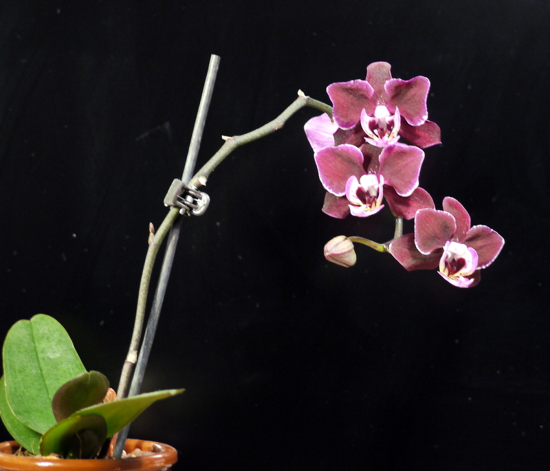 Сначала рос первый цветонос. Пришпилила его в первый раз, как только он вырос на высоту, позволяющую его наклонить к опоре над листьями. Одной прищепкой, не тугой, что бы прихватить и направить в сторону. Цветонос очень мягкий и нежный, боялась, что повредится сильно. Но ничего. Когда он чуть подрос в этом положении, поставила вторую прищепку, тугую, повыше первой. Волнительный момент был - будет ли изгибаться и как. Кривовато, конечно пошёл, зато не высоко. Оказалось, что цветонос нарастает не только снизу, от розетки, но и поверх прищепки, где бутон. Поэтому пришлось пришепки переставлять, подхватывая стебель повыше, поближе к бутону. Второй пошёл позже, когда первый уже распускаться начал. Его пришлось шпилить выше, а первый на опоре опускать, но это уже было не трудно, т.к. он к моменту цветения уже "задубел" и его можно было двигать без опасения, что сломается. Самый опасный момент - когда они молодые растут, мягенькие и нежные, мнутся и отламываются на раз. Стоит по две прищепки на цветонос, для удержания вертикальности.