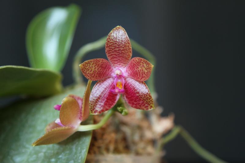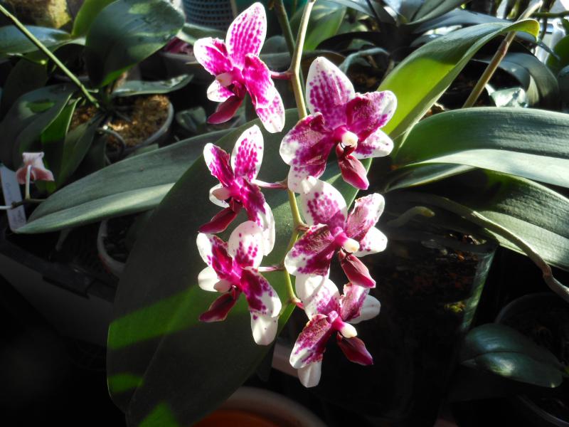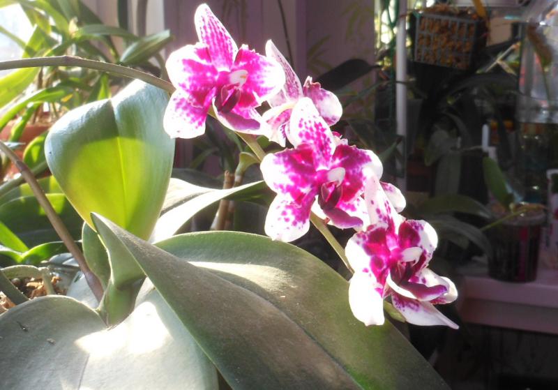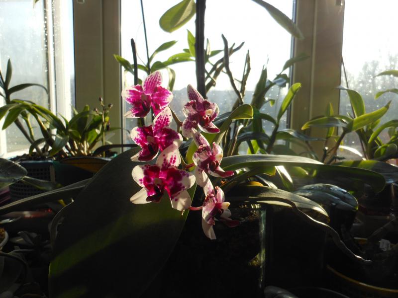 Забавное существо. Получен цветущим. Жаль, что не сфотографировала по приходу, но точно помню, что был полосато-симпатичным, приближенным к фото в каталоге. Сначала я решила не пересаживать, пока не зацветет... Зацвел