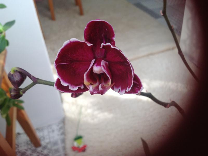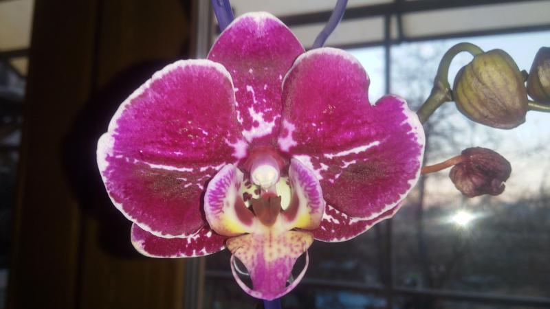 Распустил цветочек уценочный фаленопсис. Покупала с одним уже завядшим цветочком. Цветонос не стала обрезать, в итоге на нём проснулась почка и выдала 4 бутона.IMG_20151106_074607.jpg