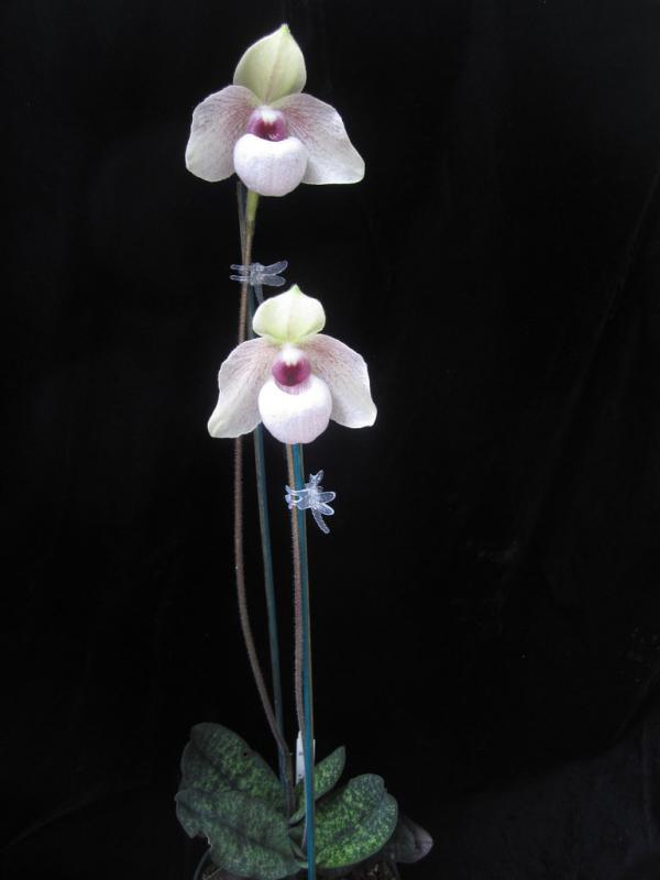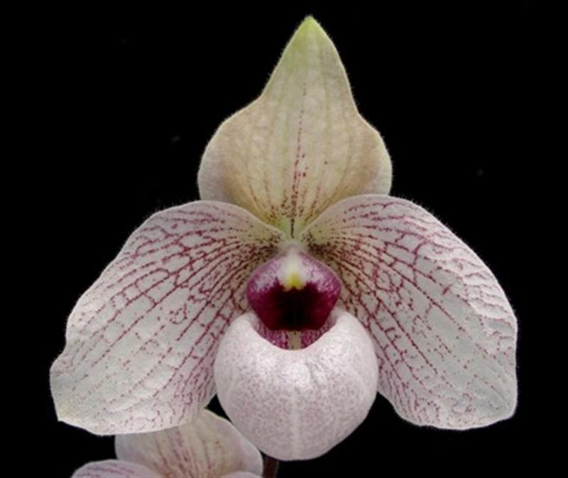 Чуток пиара Paph. Lynleigh Koopowitz (= delenatii x malipoense) Очень трогательный башмачок на длинной шее. Такой жирафик. На отращивание шеи ушло не менее трех месяцев… Самое главное в развитии бутона, найти растению подходящее место и не менять его местоположения до самого раскрытия цветка.  Цветок ароматный, МАЛИНОЙ пахнет. Длинна шеи у него 40 см, а ширина цветка — 11 см.
