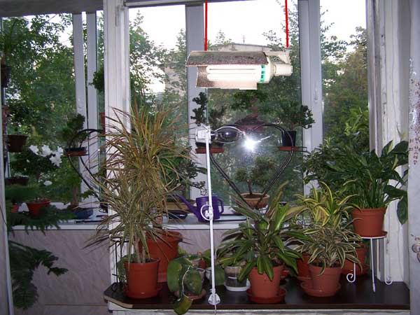 По поводу энергосберегалок - необходимо учесть, что их световой поток круговой, при горизонтальной подвеске из 12000 люмен вы едва получите треть на растения (если не совать лампу прямо среди них), а остальное вбок и вверх. Ориентировочно эти 4000 полезных люмен на полуметровом расстоянии дадут примерно 5000 лк, не больше, хотя как подсветка на окне сгодится. Зеркало (обычное...) над лампой увеличит освещенность процентов на 30 - 40 за счет отражения той части светового потока, которая идет вверх. Рефлакс 250 вт дает больше 50000 лк на полуметре. Здесь есть о чем подумать. Упомянутые проблемы безопасности умозрительные - просто из соображений "и палка раз в год стреляет" - их надо решать консультацией с квалифицированным электриком. Рефлаксу нужна допзащита - автомат, прерывающий питание при любом сбое в работе. Все провода у нас с ПВХ и гореть будут, хоть и с неудовольствием.