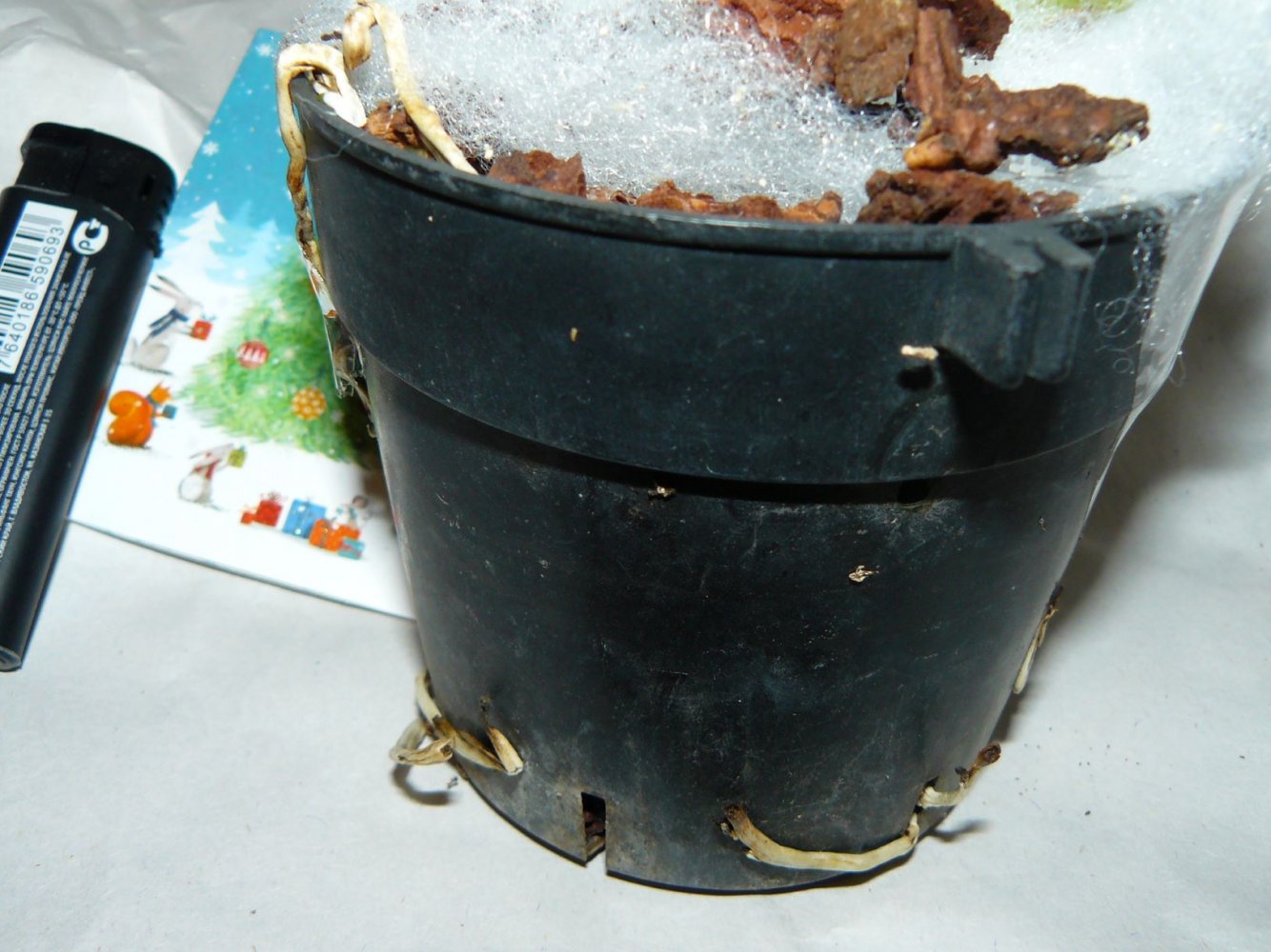 Каттлея шикарная! 5 больших бульб, куча корней (торчат из горшка снизу), сидит в чистой коре. Сверху кора прикрыта, чтоб не высыпалась. Я думала, она меньше будет..На этикетке - А19 . И в подарок - прикольная открыточка с Новым Годом! Ух, приятно. Спасибо.
