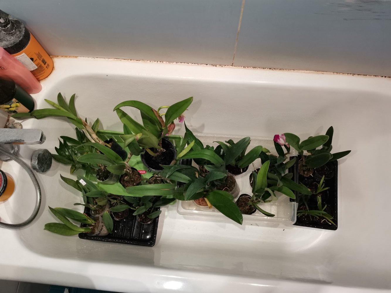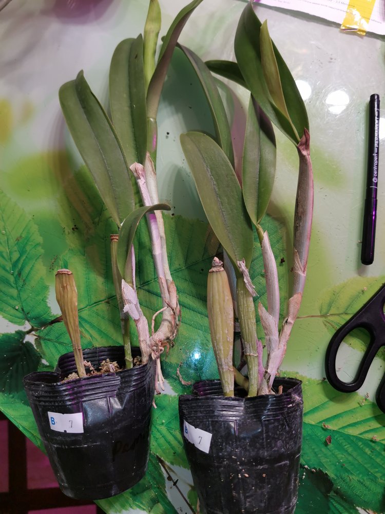 Каттлеи неплохие, 1,5 л бутылка для масштаба. Левая явно не триана, два раза цвела у Мики (срезанные цветоносы). Правая возможно и триана какая-нибудь - крепкая, молодая, хороший новый рост.