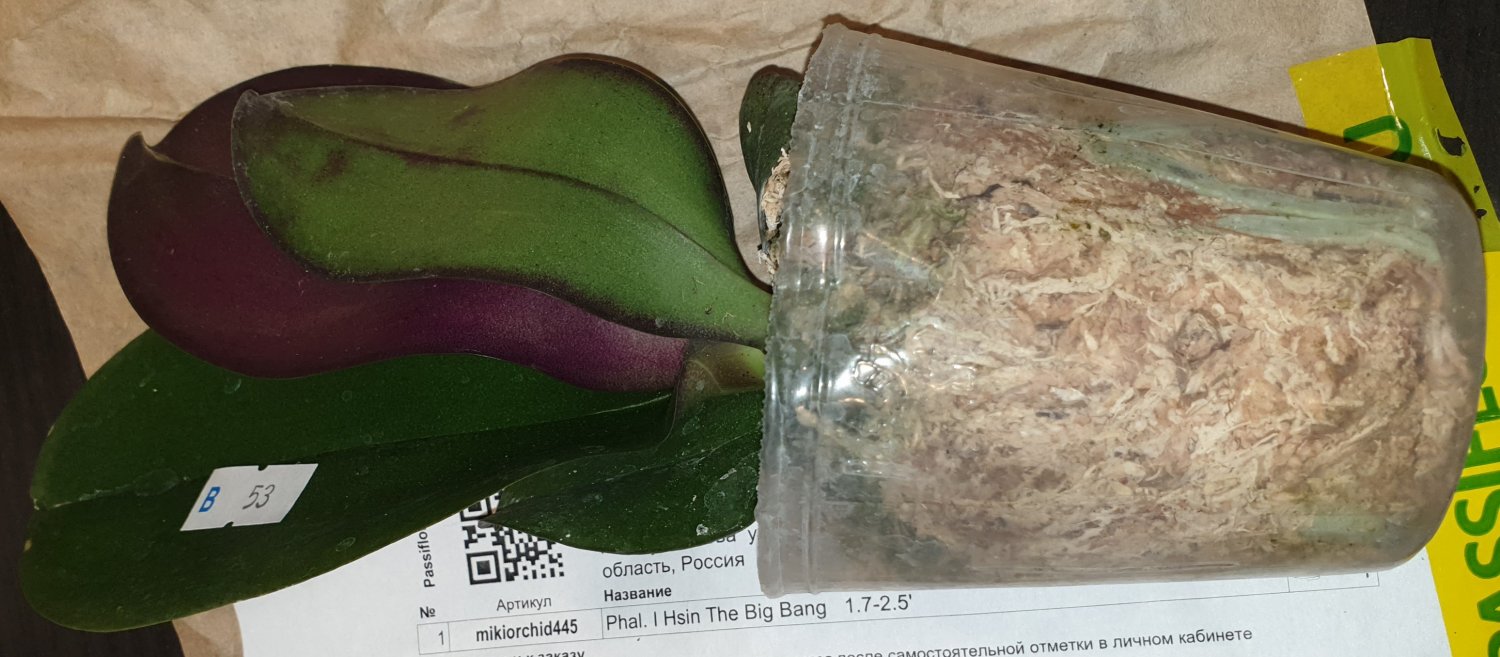Phal. I Hsin The Big Bang 1.7-2.5', вот у него не совпадает номер маркировки и в накладной. Печально если замена.Размеру соответствует, красавец, наметился цветоносик