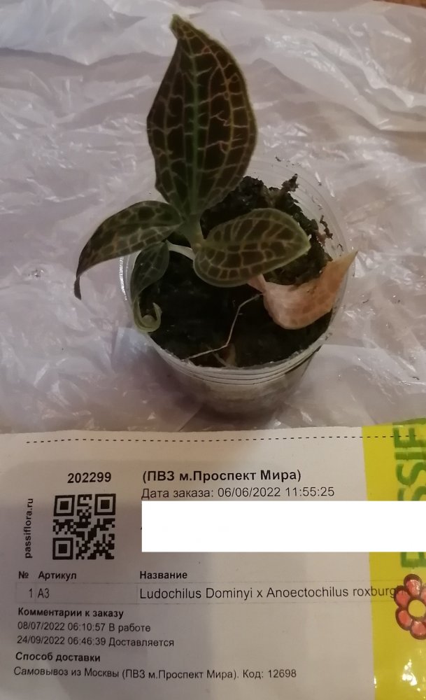 В заказе одно растение: paph. Daisy Barclay 3,5. Получено через день после смс в ПВЗ. Пока ждала, заказ сильно подрос в цене. Реально пришло в горшке 2,5 небольшое, но крепенькое. Код на наклейке соответствует накладной.