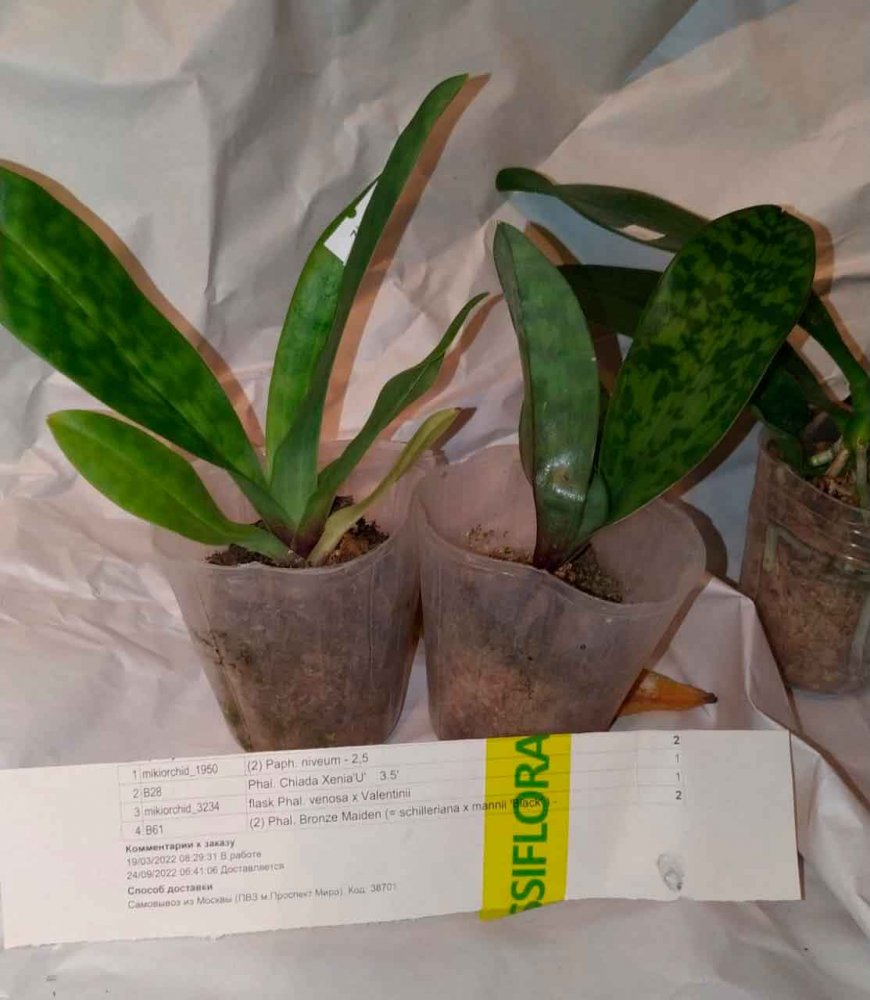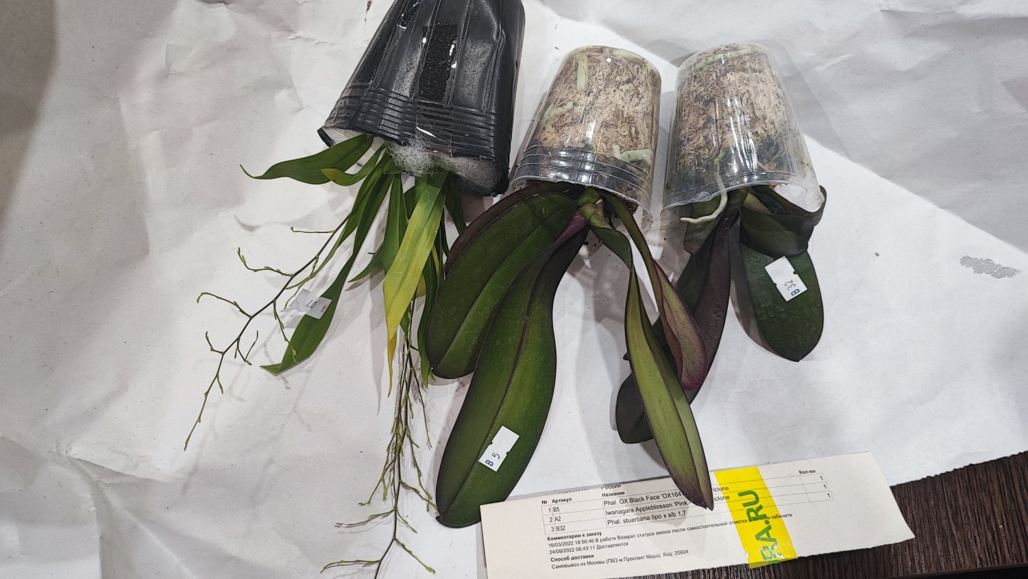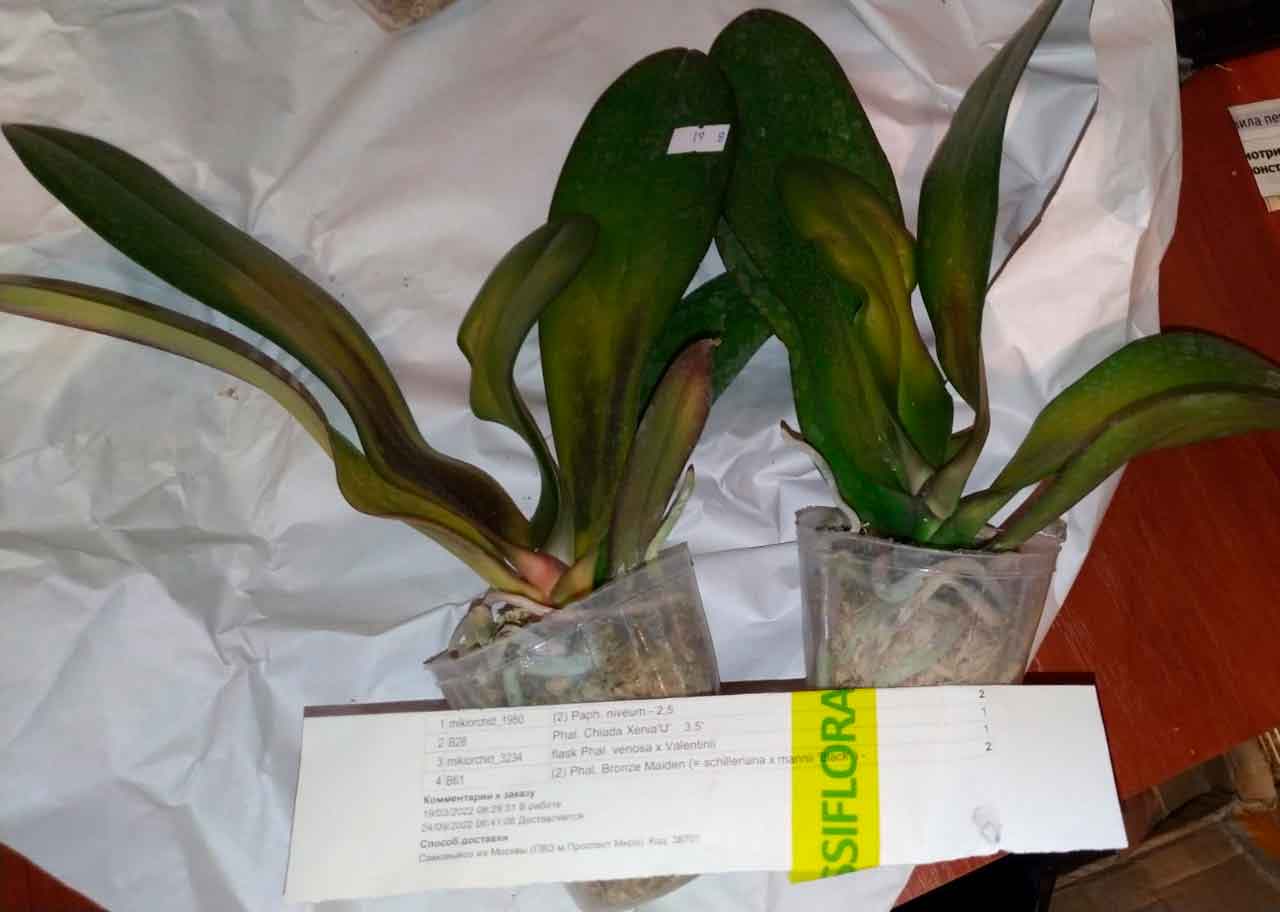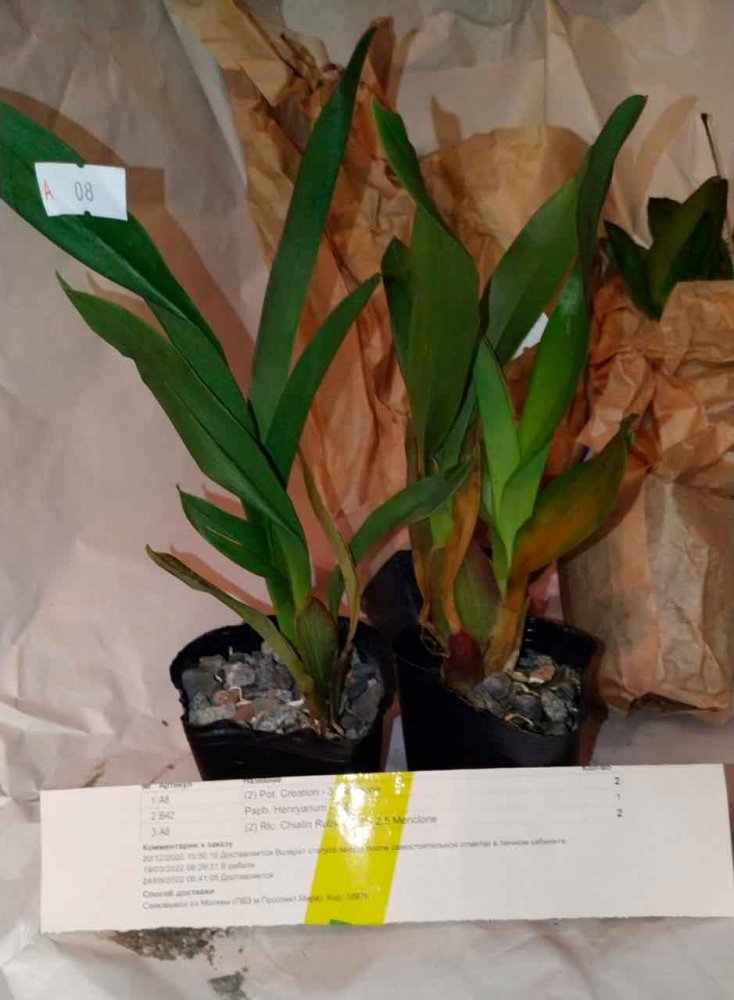 F3948411-DF19-4E71-B317-3A422B374E40.jpegВместо черноволосого дендробиум дендрофаленопсис, сильно пострадавший при перевозке. Два одинаковых башмачка явно каллосумной группы, т.е. как минимум один из них пересорт вместо дорогого гибрида. Фаленопсисы один хороший в 1,7, второй с сгнившим стеблем.