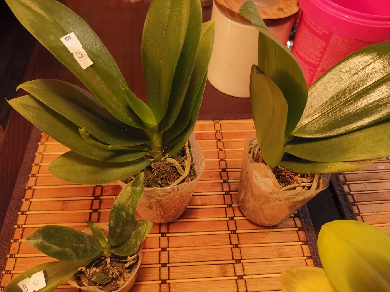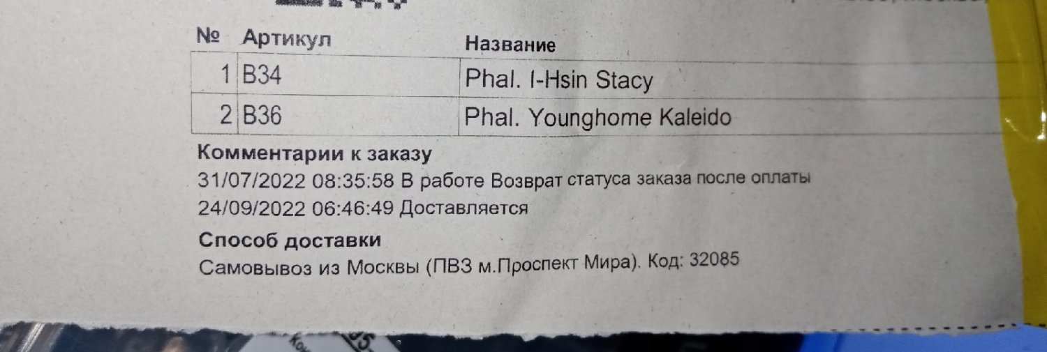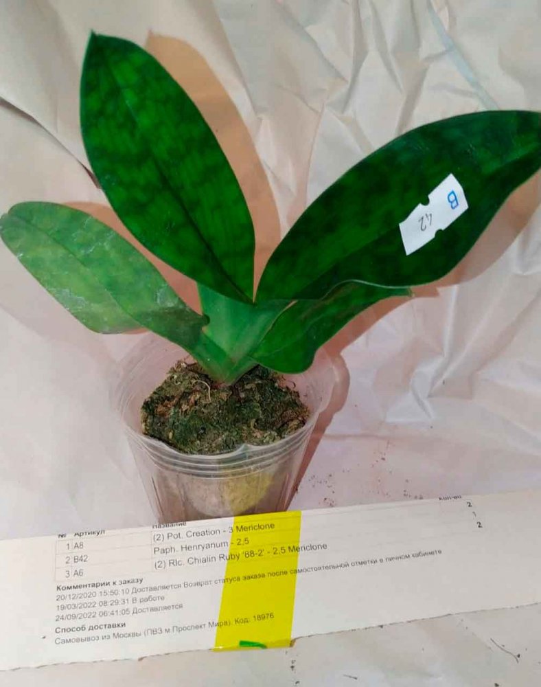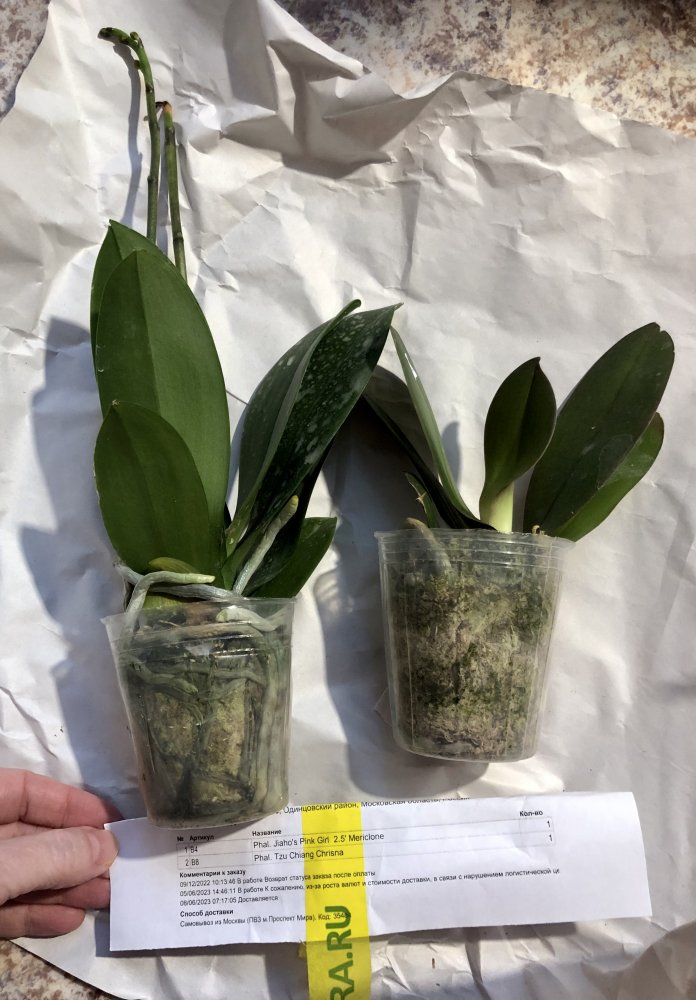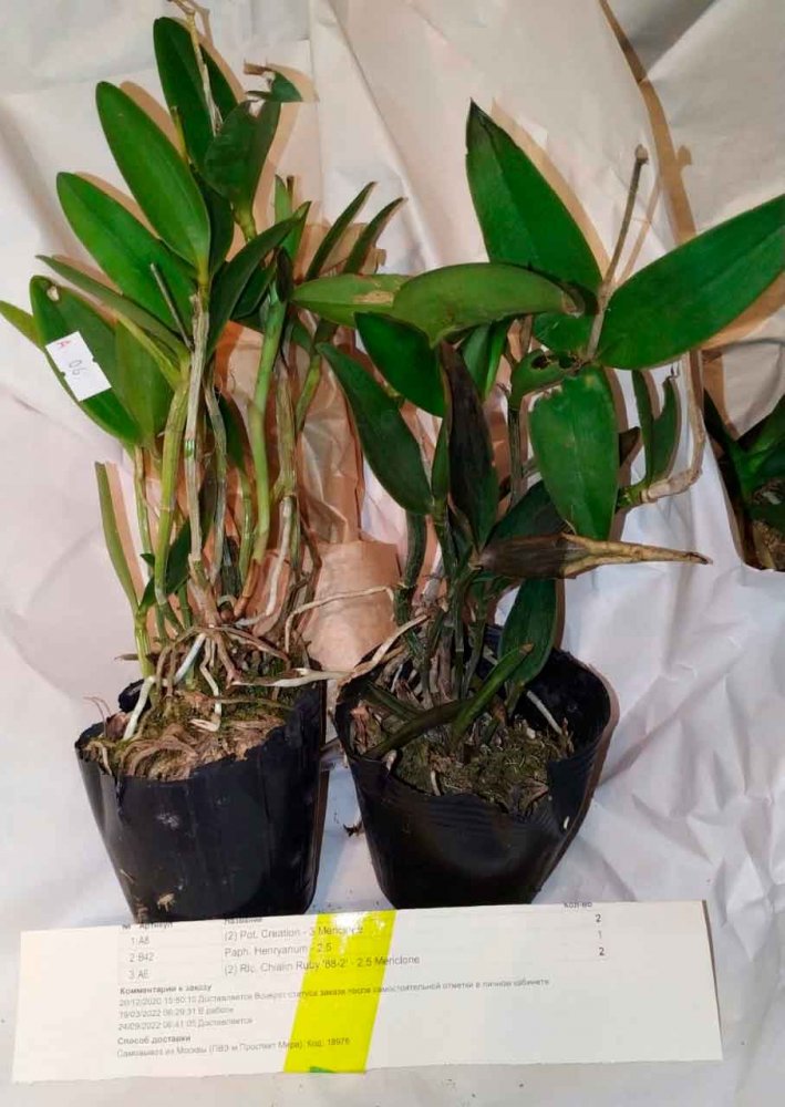 F3948411-DF19-4E71-B317-3A422B374E40.jpegВместо черноволосого дендробиум дендрофаленопсис, сильно пострадавший при перевозке. Два одинаковых башмачка явно каллосумной группы, т.е. как минимум один из них пересорт вместо дорогого гибрида. Фаленопсисы один хороший в 1,7, второй с сгнившим стеблем.