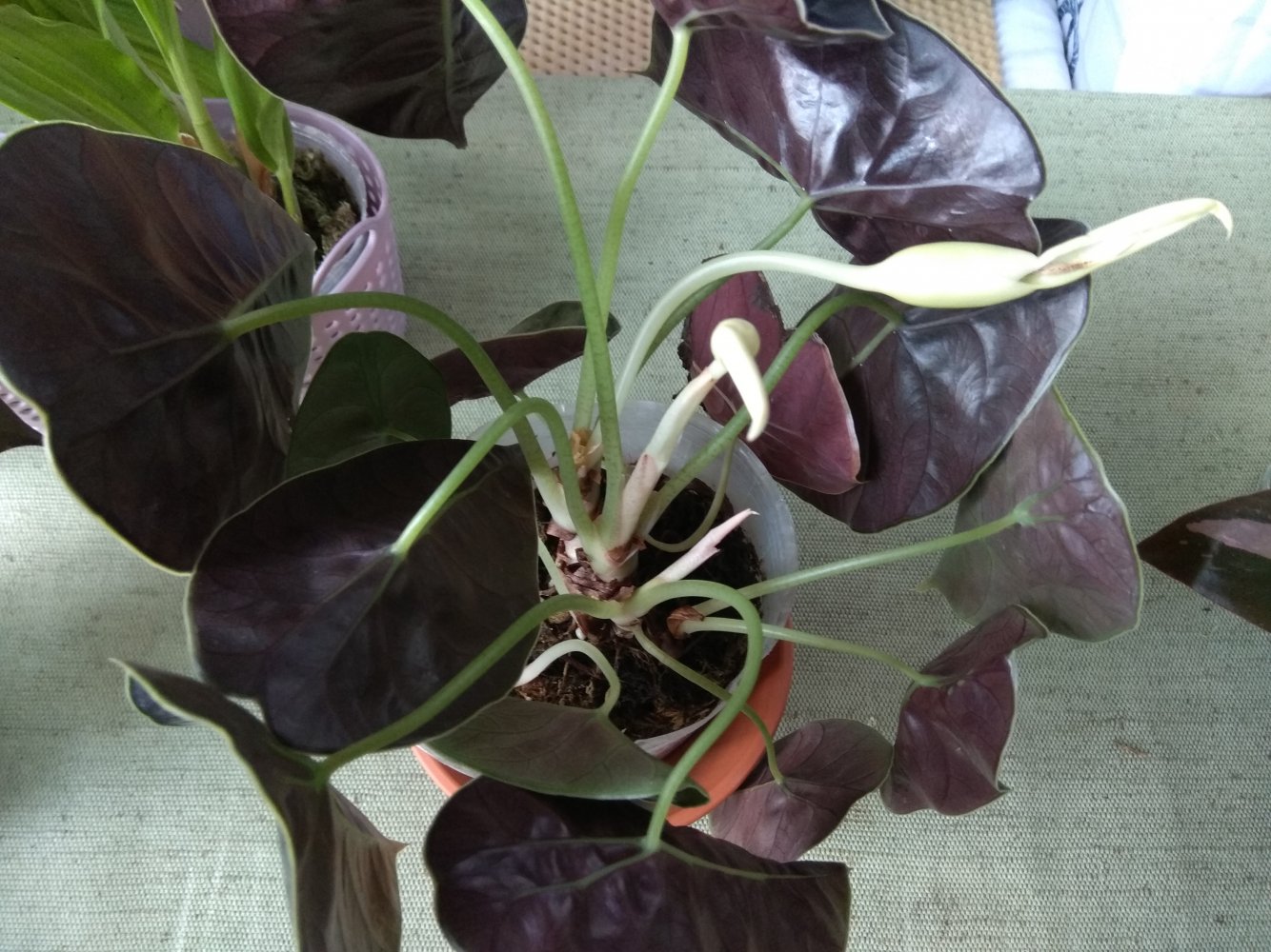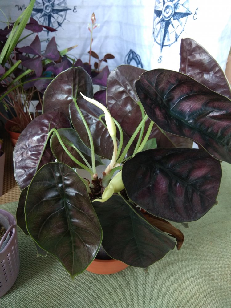 А мне Мики прислал заказанную Алоказию Азлани - без замены, красивую, а я даже не сразу поняла, что она цветёт. Поэтому, вот - цветущая Алоказия Азлани: