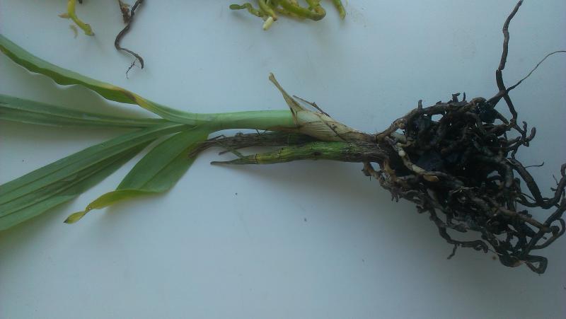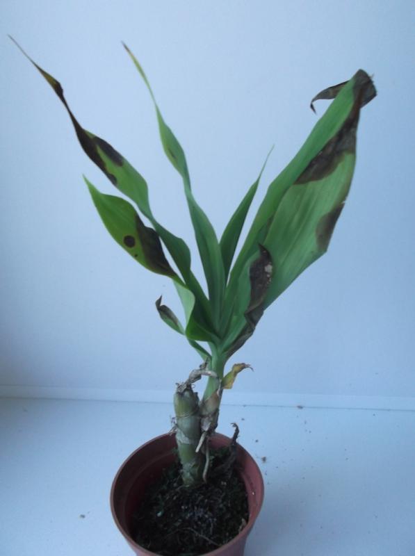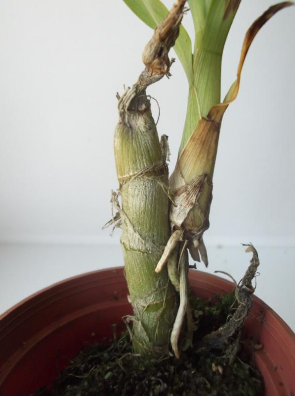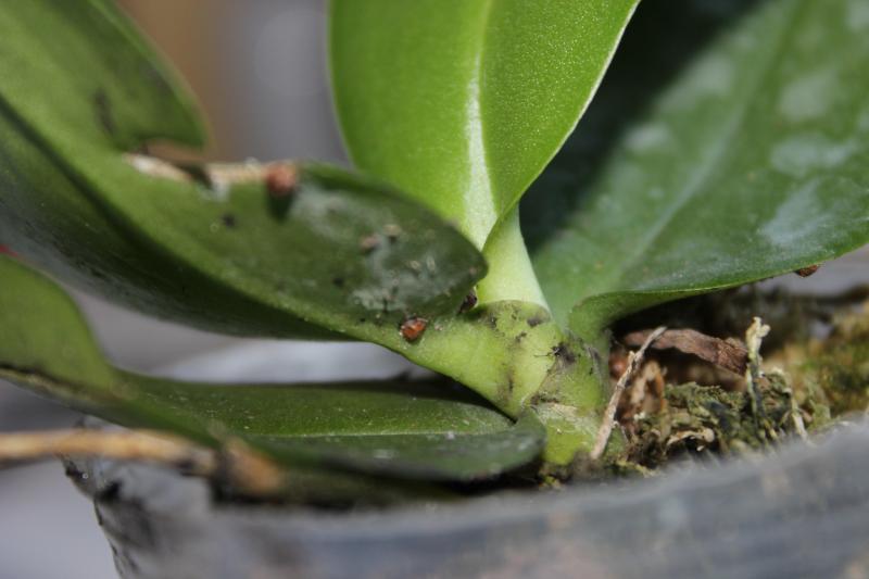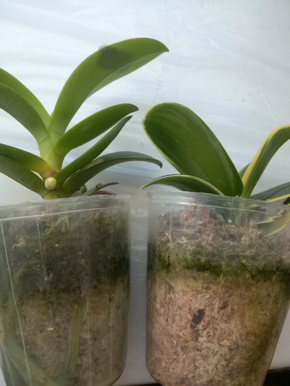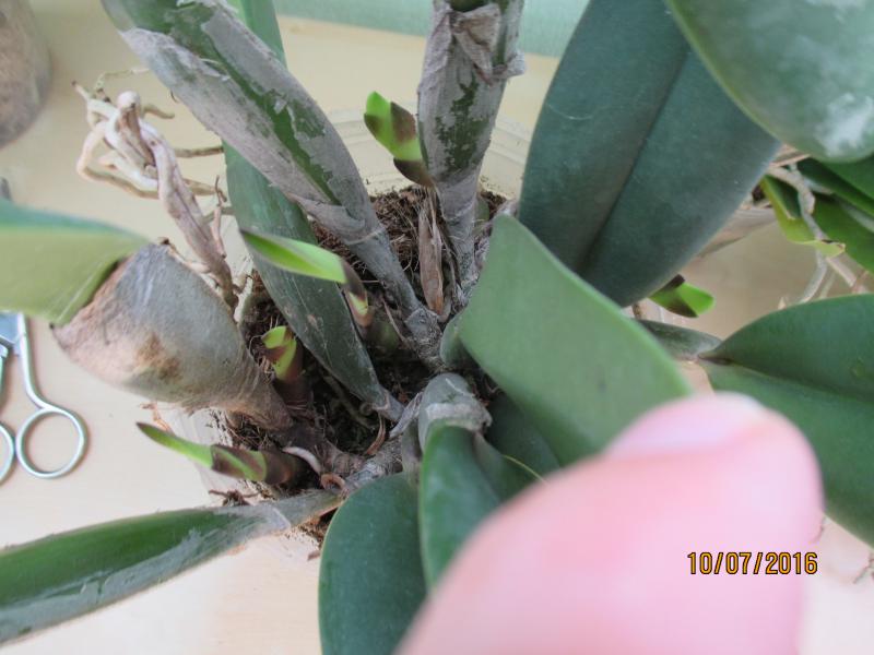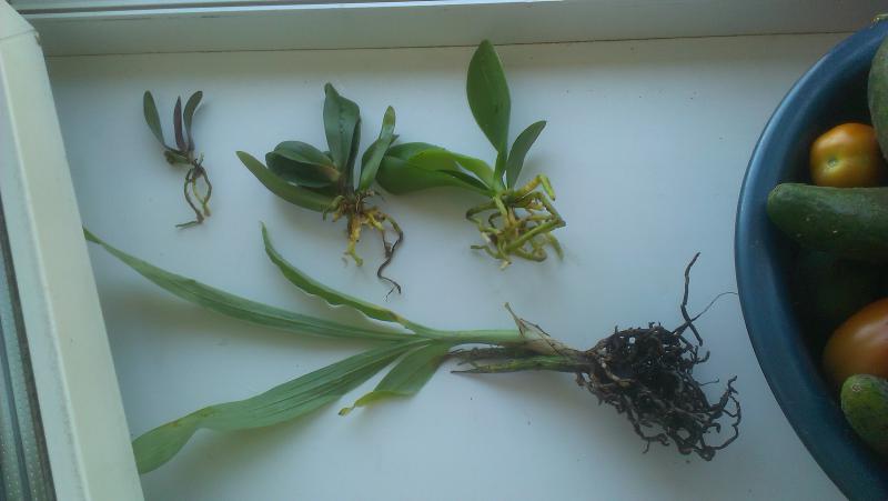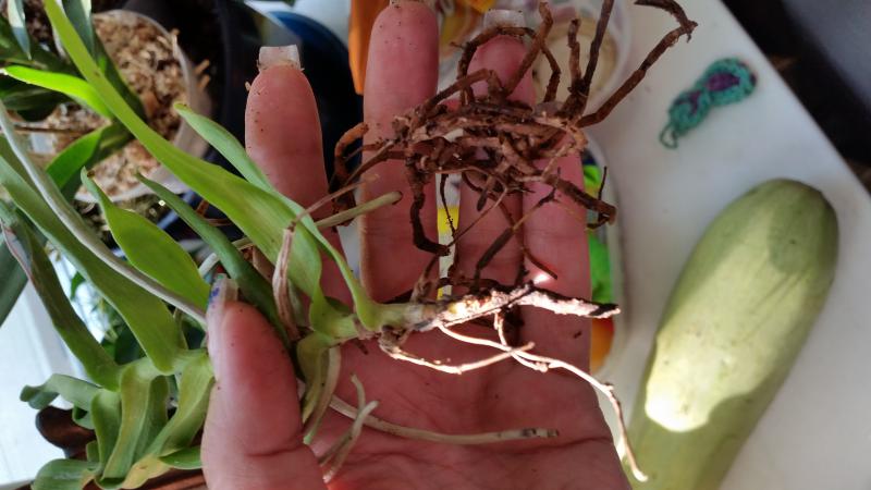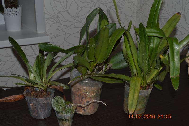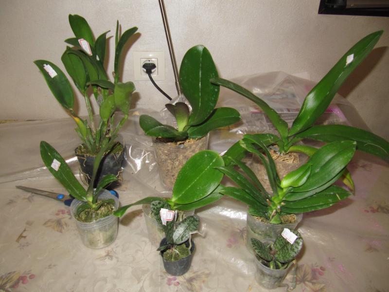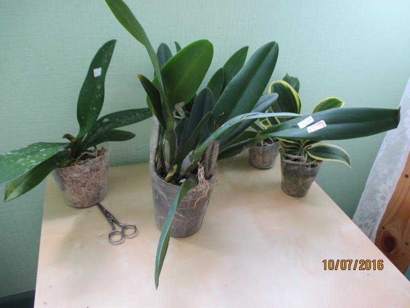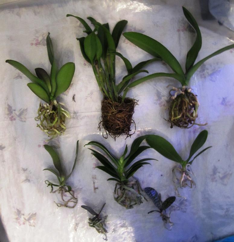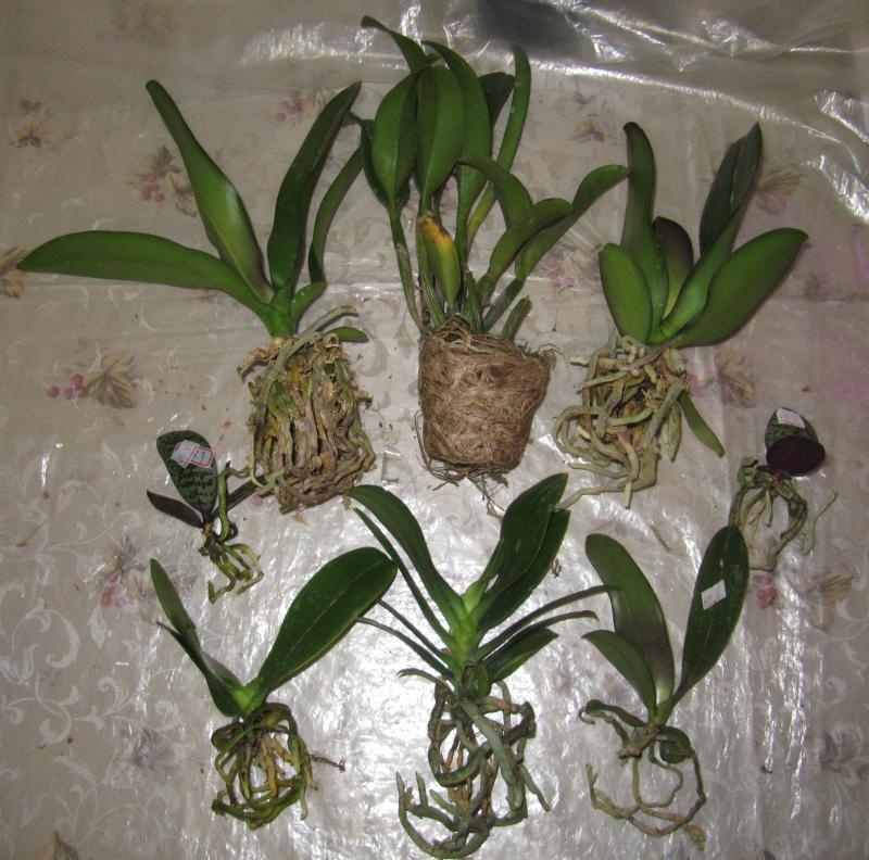Растениями, в целом, довольна. Все бодренькие, тургор отличный, гнили на шейках нет, пятен подозрительных нет, есть небольшие механические повреждения листьев, немного подгнивших корней и сухие корни у катлеи.