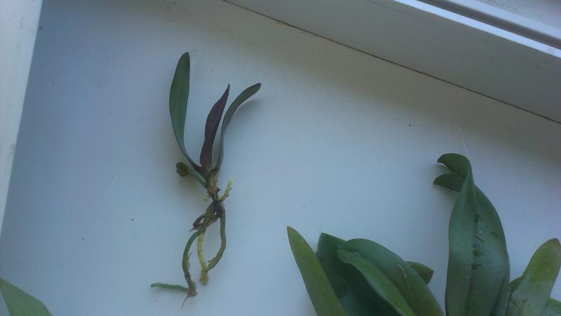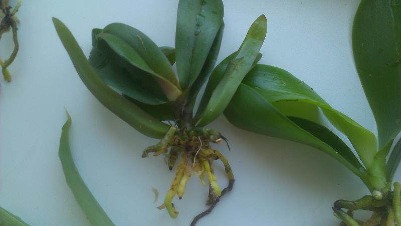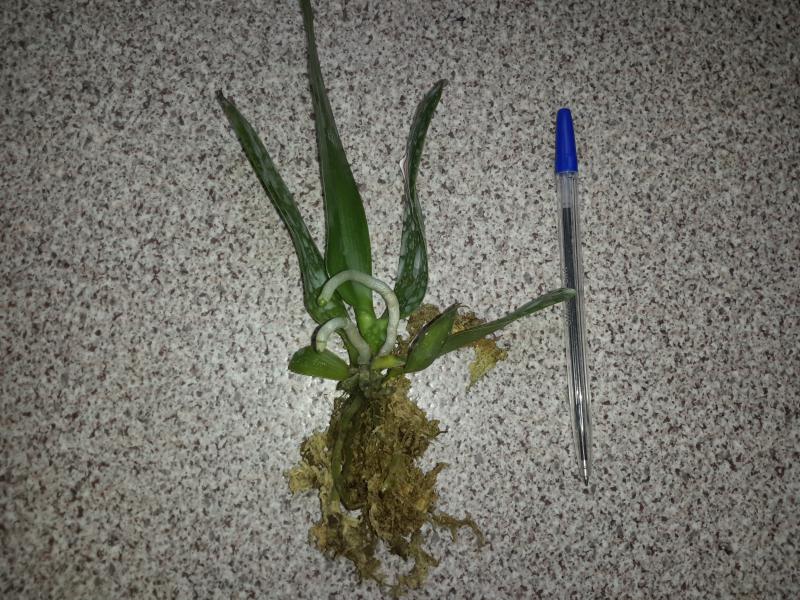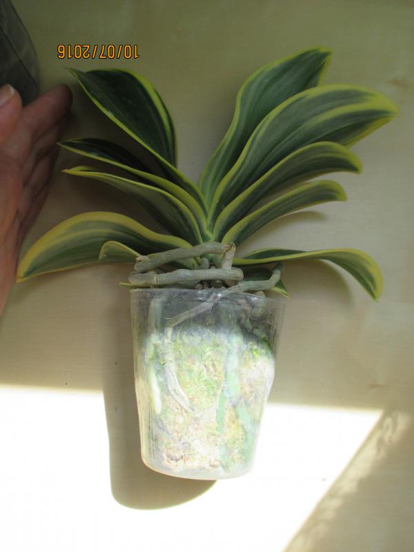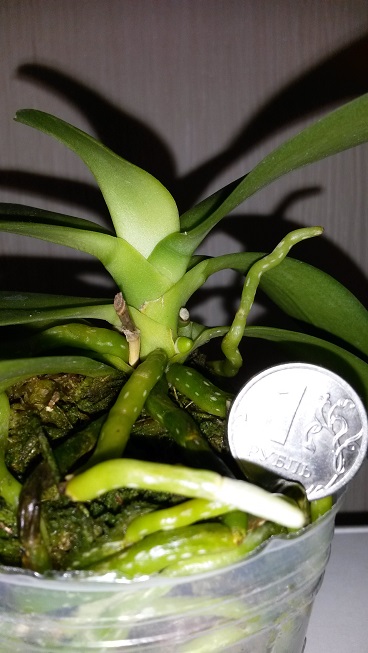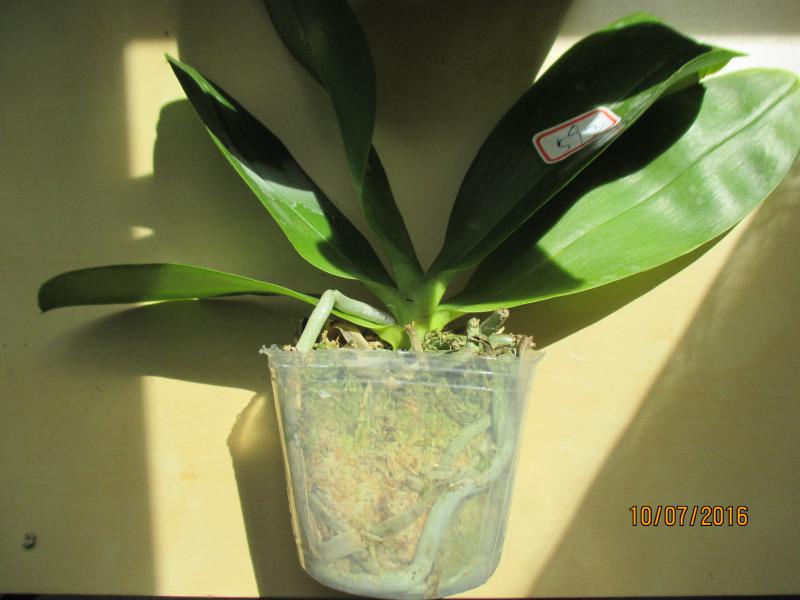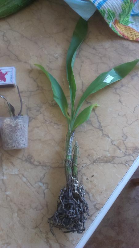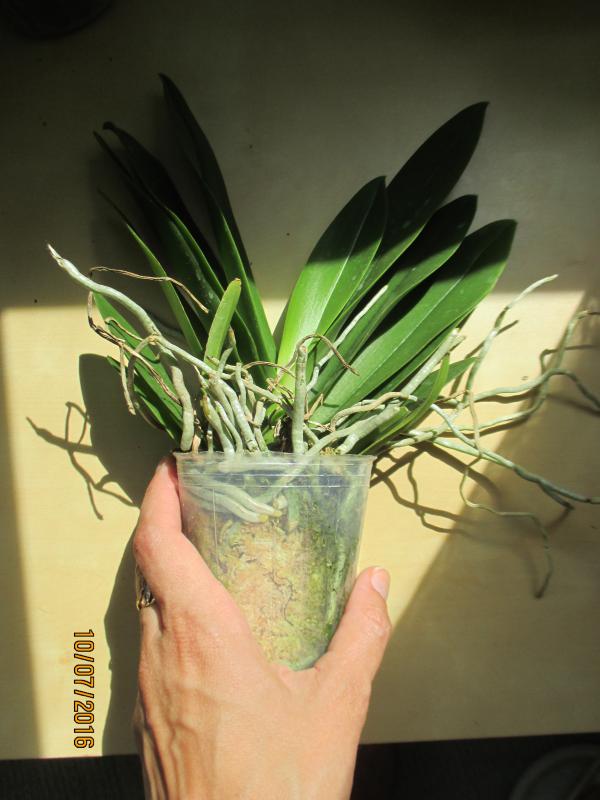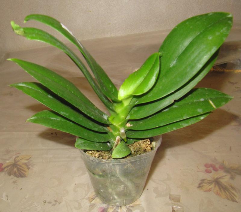 Замечательное взрослое растение - два срезанных цветоноса, лезет новый цветонос, новые корешки. По размеру - миди. Было немного подгнивших снизу корней, но количество живых достаточное.