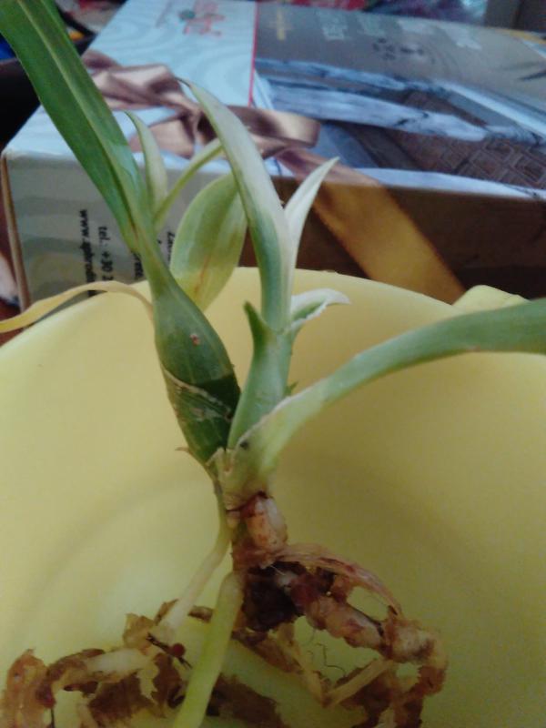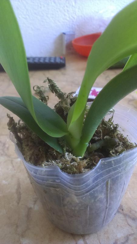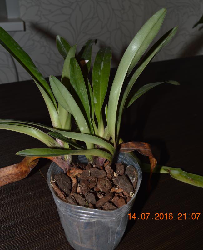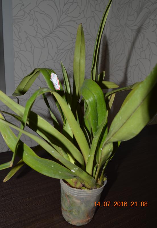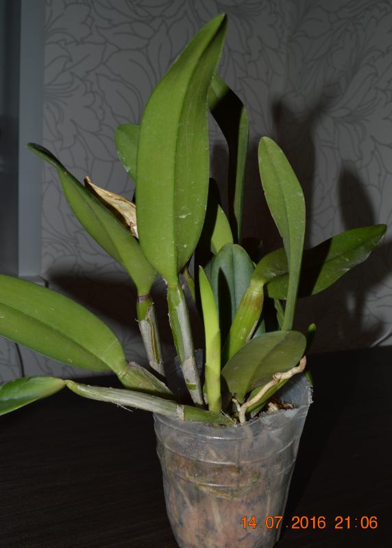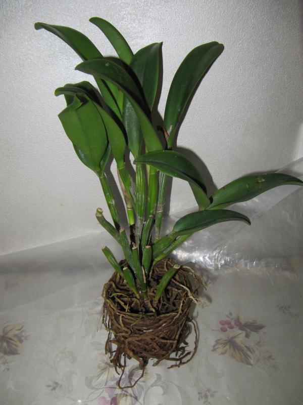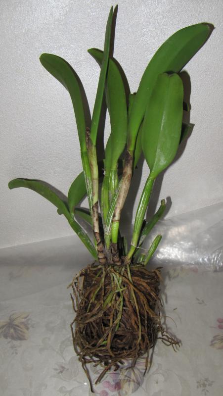 Моя первая катлейка. Поскольку в них не разбираюсь, то оценить состояние могу только поверхностно - тургор листьев отличный. 17!!! бульб, из них 5 уже цвели, три молоденькие, а вот 8 совсем без листьев - что с ними делать - пока не знаю - буду читать форум. Корни тоже смущают - после отпаивания, вроде и кое-какие отошли, немного живых, но основная масса пересушены - наверное, надо их удалять. Но растение взрослое, надеюсь, восстановится и порадует меня цветением.