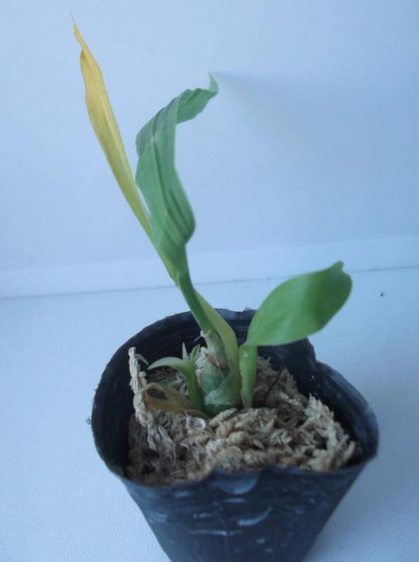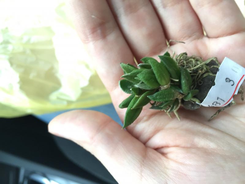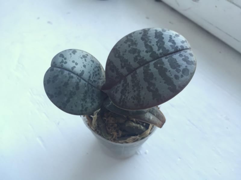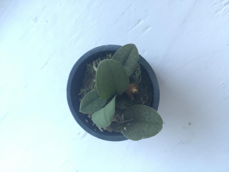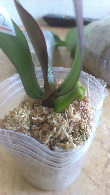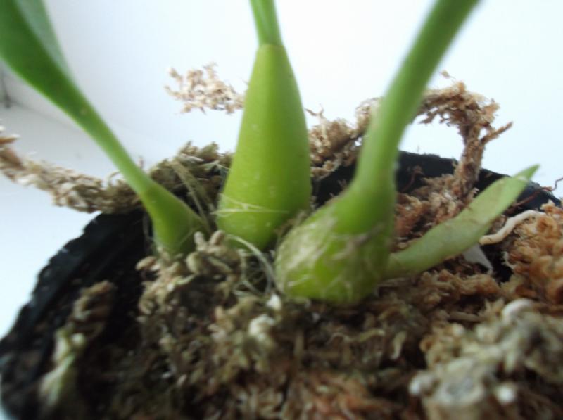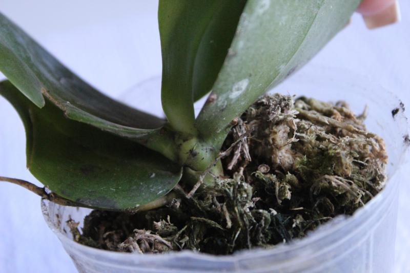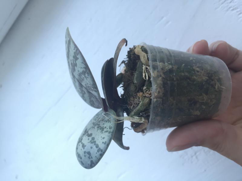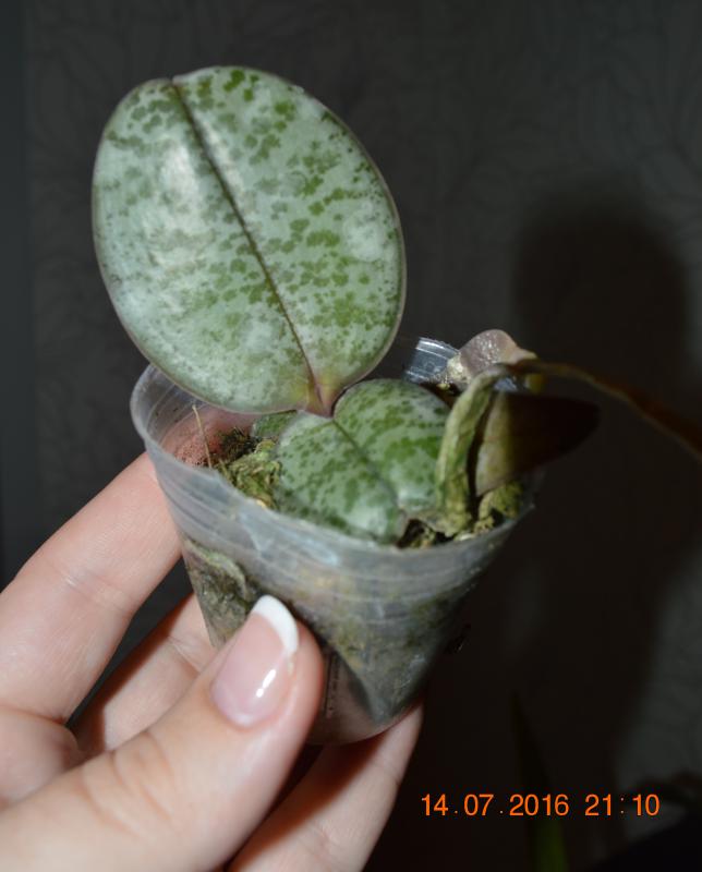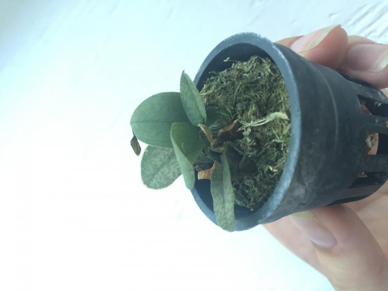 Совсем малышка с 3 листиками, но упругими. Мох был пересушен, но после отпаивания корешки восстановила, думаю, все будет хорошо.