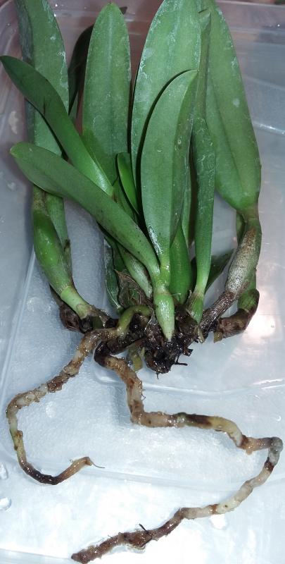 Lc.Mona Pink'Hiromi'AM/AOS - пришла, видимо, в Москву совсем мокрая - Ирина ее просушивала. Но корни за 5 дней дороги сгнили почти полностью. Листья замечательные, бульбы налитые. Очень много молодых ростов. Такая лапочка, очень жать будет, если гниль пойдет по ризоме. Обрезать её было очень сложно - бульбы махонькие(катлея миниатюрная), растут компактно.