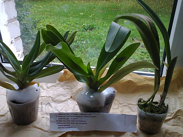 Из 5 заказанных растений пришло только 3. О них и расскажу: P. Gloria Naugle, P. Rothschildianum, Bl. Morning Glory v.Valentine Kiss (на фото слева на право)