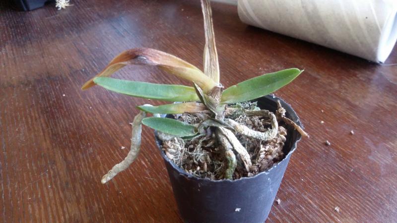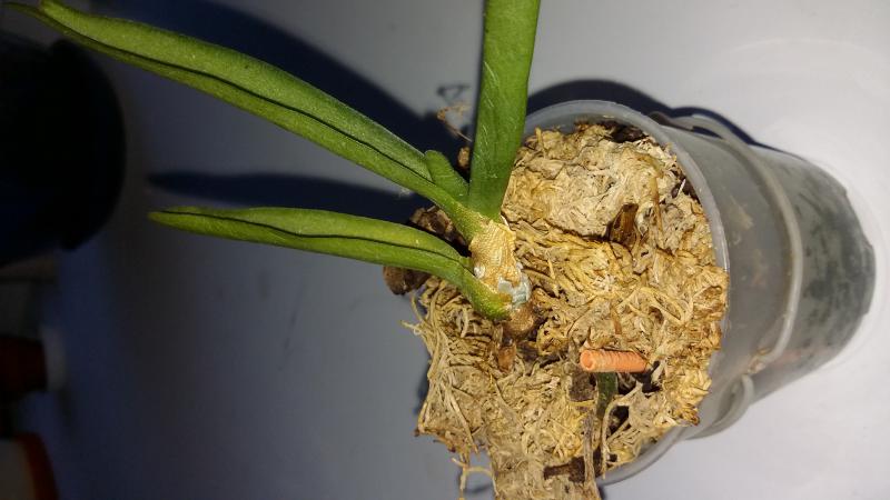 судя по фото, растюшка сильно обезвожена... что бы я сделала в этом случае: достала ангрекум из этого субстрата и горшка, возможно, замочила бы в алирине с гамаиром (чисто на всякий случай, как профилактику для такого ослабленного пациента) и посадила в среднюю орхиату безо мха вообще (!) в горшок поменьше, чем сейчас. далее - где-то раз в неделю опрыскивала бы удобрямсом с янтарной кислотой или ее раствором. причем надо именно опрыскивать, не поливать! корни нарастают очень хорошо. полив - теплым душем по потребности, для ангрекумов, как я заметила, лучше частый полив с просушкой, чем постоянная, хоть и небольшая, влажность. мох они из-за этого и не любят, сбрасывают корни...