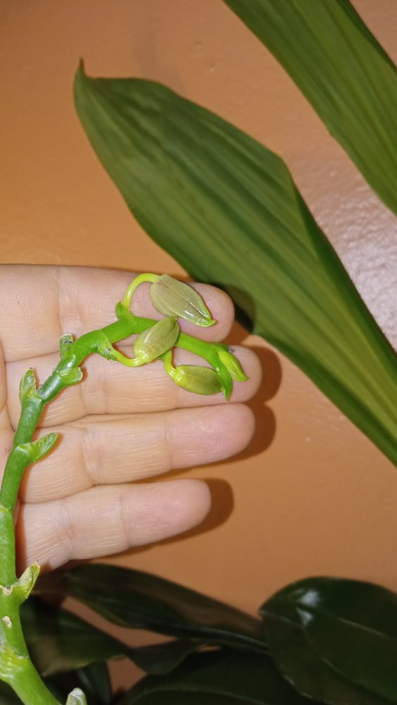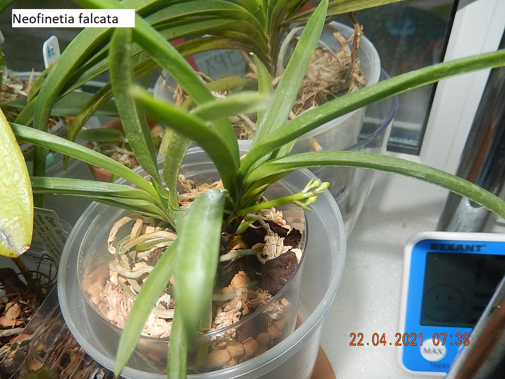 получала от Мики 25.12.20, правда ждала 2 года, сразу поставила на лоджию в прохладу сбоку от ламп (где место нашлось), смачивала по чуть-чуть и редко. Пришла в мелкой коре. Вначале марта пересадила в чуть больший горшочек в туже мелкую кору + чуть мха + чуть лжепапортника. А сегодня при утреннем осмотре обнаружила цветонос - это заслуга Мики! Активно растут корни.