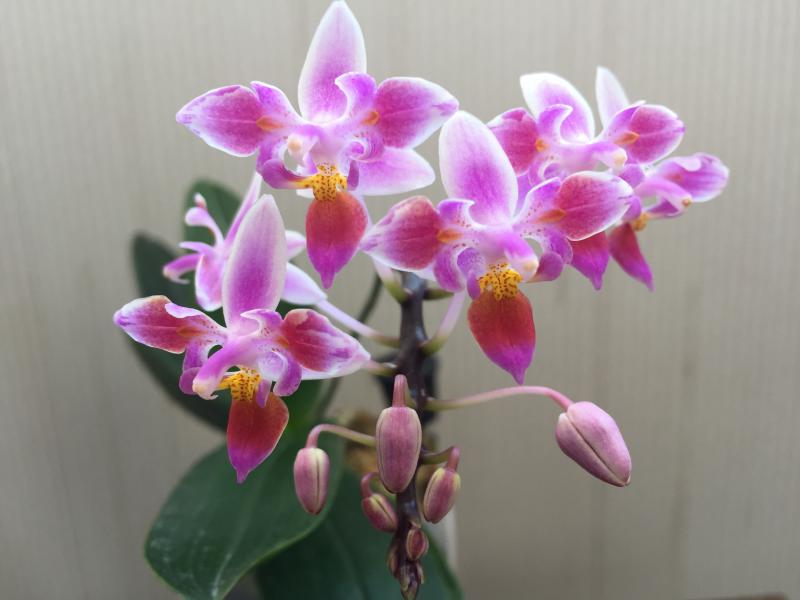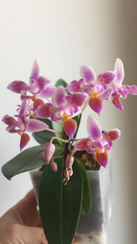 Светило, equestris - мини фаленопсис. Цветок 1,5 - 2 см. Цветонос около 10 см, на котором образуется гроздь цветков. Эта гроздь умещается в моей ладошке) После цветения на цветоносе часто образуются детки ( но это происходит при определенной влажности воздуха). Маленькие детки иногда сами выдают цветонос.Фото общего плана у меня не много. На втором фото я держу горшочек в руке.