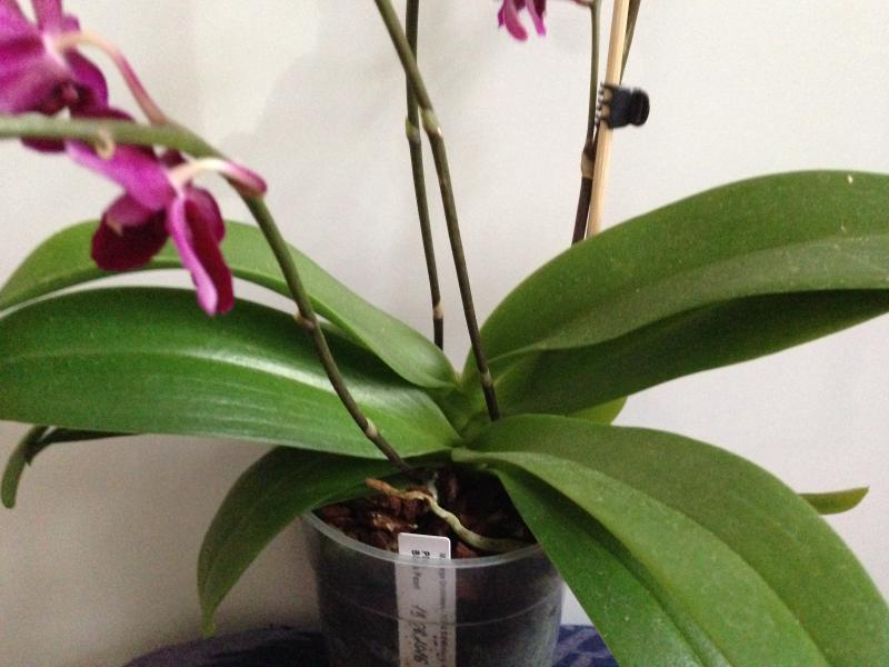 Хорошее качество, в горшке большое растение и то ли детка, то ли 2й фаленопсис поменьше. Нижние листья в светлых пятнах, будто что-то с питанием было не то. Но пара больших верхних уже в порядке. 2 цветоноса, один коротенький с завядшим цветком и второй длиной сантиметров 50 и 4-мя остатками от цветов на кончике. Чуть позже пересажу, т.к. он сидит в горшочке такой формы, что после полива на дне остаётся вода. Для моих комнатных условий это не то, что нужно.