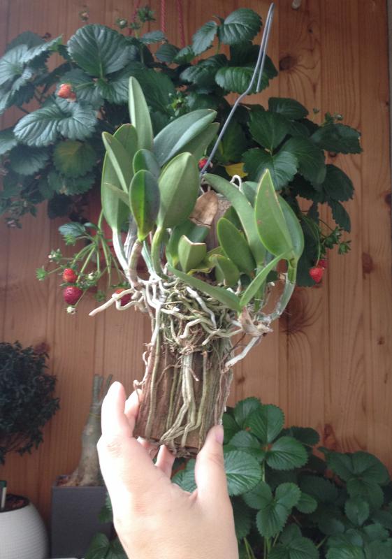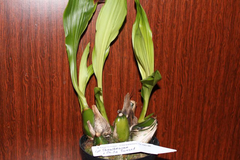 Sophrolaeliocattleya Mea Hawkins Miya длинная крепкая куртинка, растущая в двух направлениях, насчитала 18 бульб хорошенькая:), на такой деревяшке с крючком, удобно сразу можно вешать на балкон: