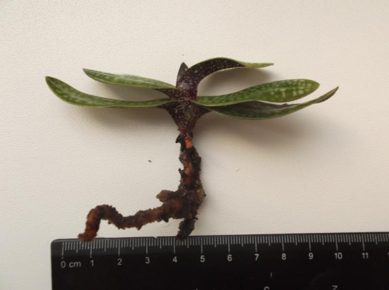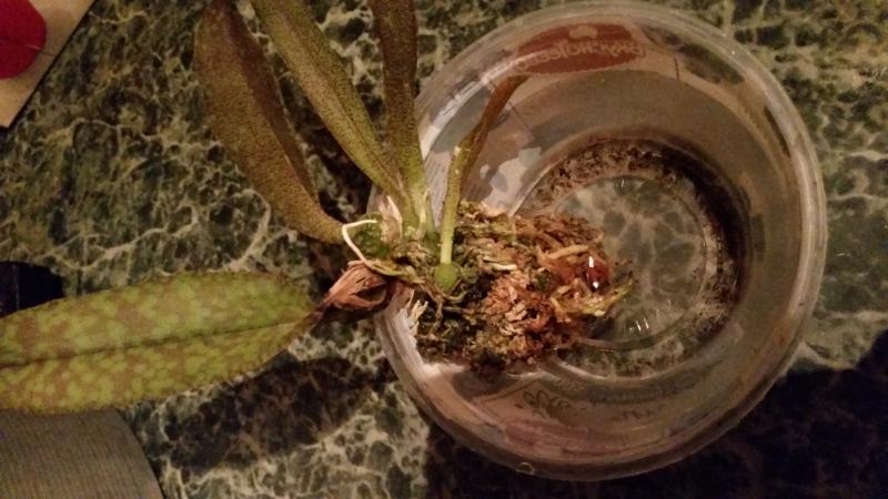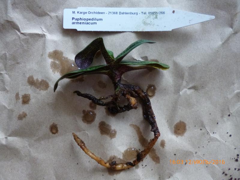 Paph. Armeniacum: одна небольшая розетка, молодых ростов нет, столонов нет, корней мало, из них несколько гнилых пришлось отрезать. Само растение чистое, однако при пересадке, в горшке оказались симпатичные сороконожки :girl_amaze: Вся живность из горшка осталась жива и отпущена на свободу :). Я рассчитывала на более качественный экземпляр... Судите сами: