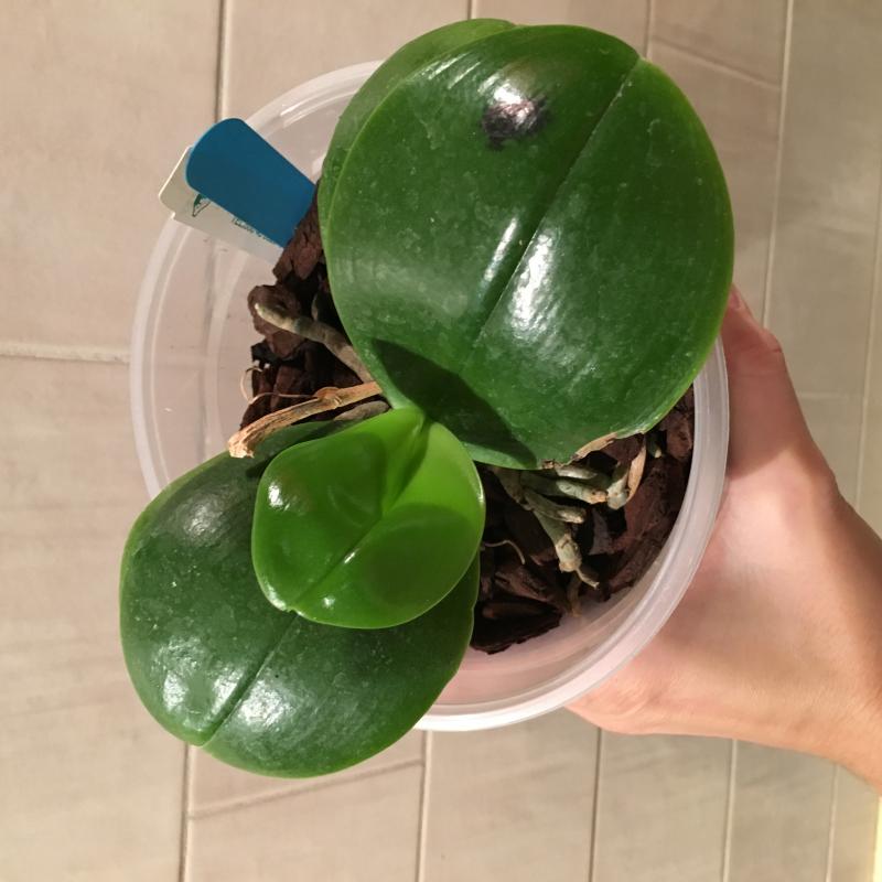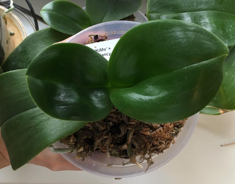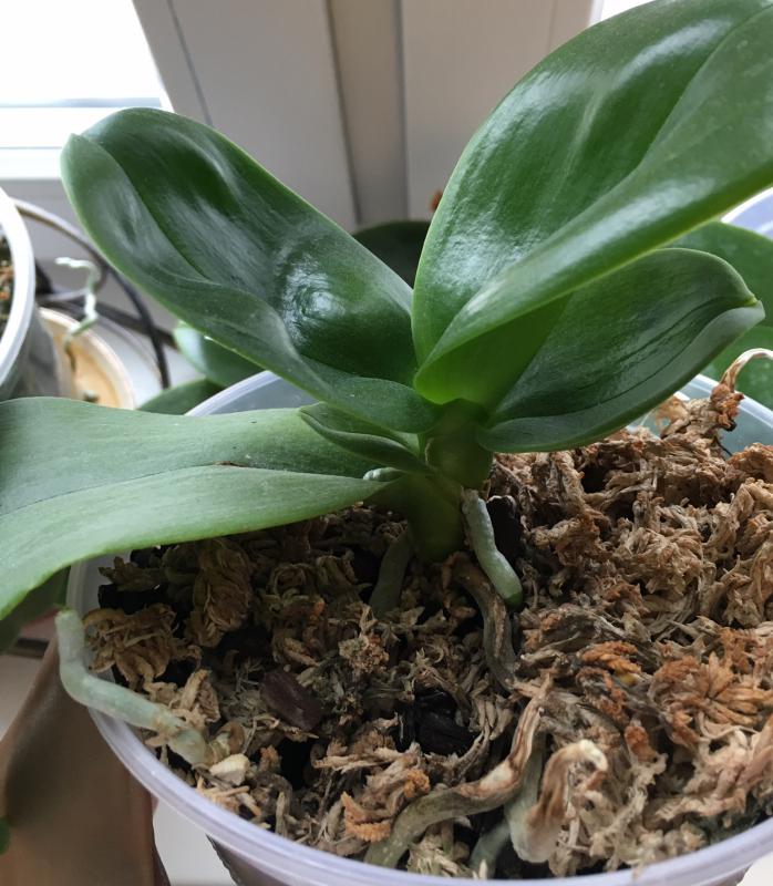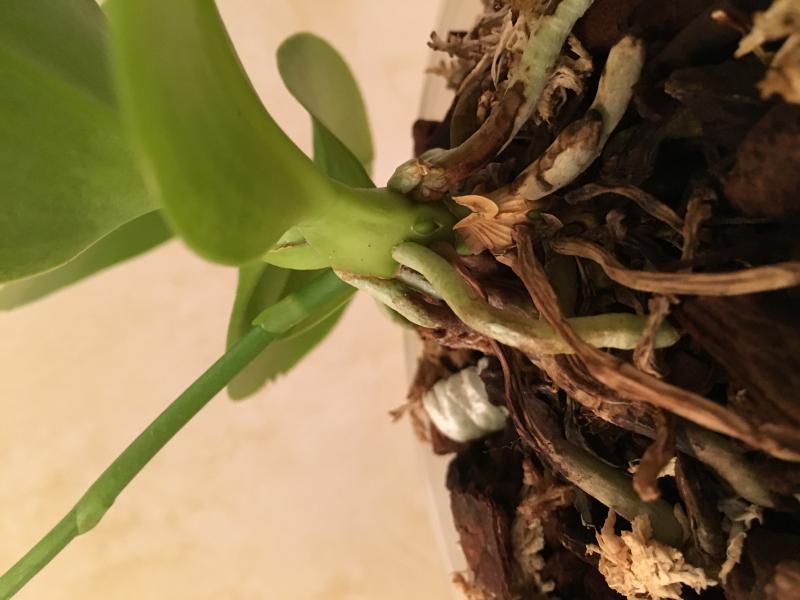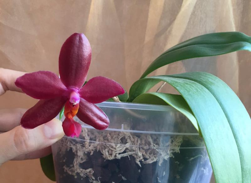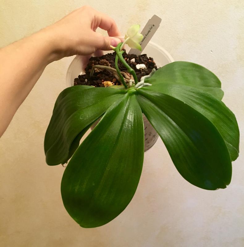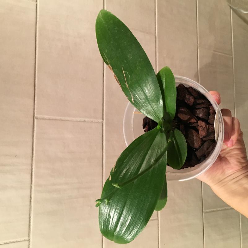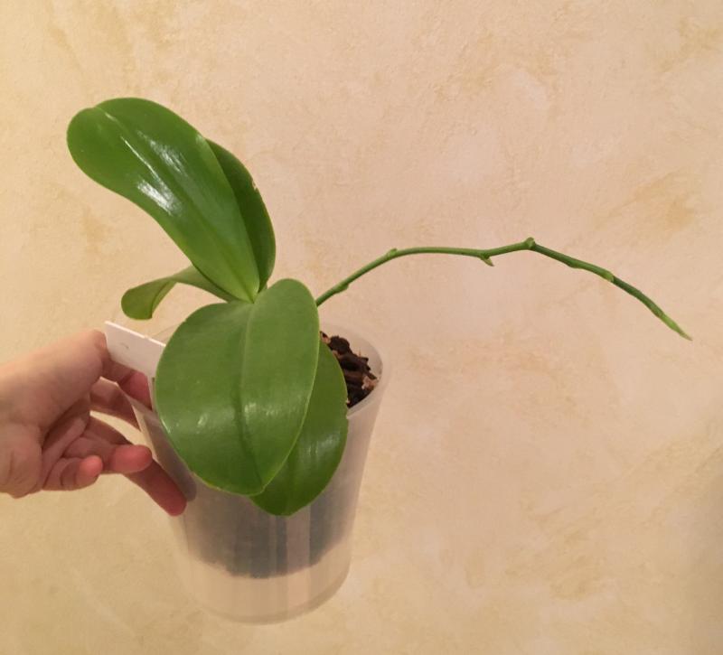 Хорошее состояние, адаптировался в новом горшочке, пошел в рост (корешки и новый листик). Цветонос пока имеется, но пока без движения.