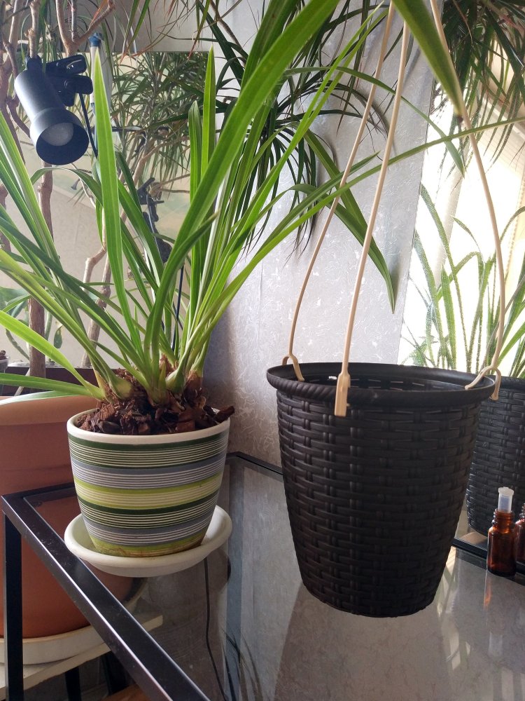 Наталья, спасибо большое за обстоятельный ответ! Нет, делить как раз совсем его не собирался, только перевалить в новую посудину... Теперь думаю какой объем взять.. Там сейчас керамический горшок 13 см. и у меня впечатление, что растень уже хочет вылезти из него наверх (фото 1-2)-сидит высоко. А на 3 см побольше объем нового, Вы считаете уже это много..? Купил кашпо- 3 фото (хочу подвесить его у она), и, думал посадить прямо в него, без внутреннего горшка (внутренний на ножках и по размеру всего на сантиметр больше нынешнего 4-фото)...Само пустое кашпо уже 16см..У цимбов очень плотный запутанный клубок корней, распутать без травм и обрезок не получится.