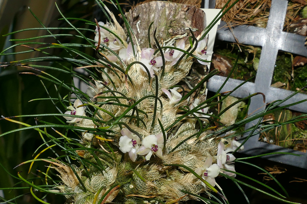 Псевдобульбы почти незаметны под покрывающими их жёлто-коричневыми волокнами, которые напоминают что-то вроде миниатюрных сетчатых корзин.